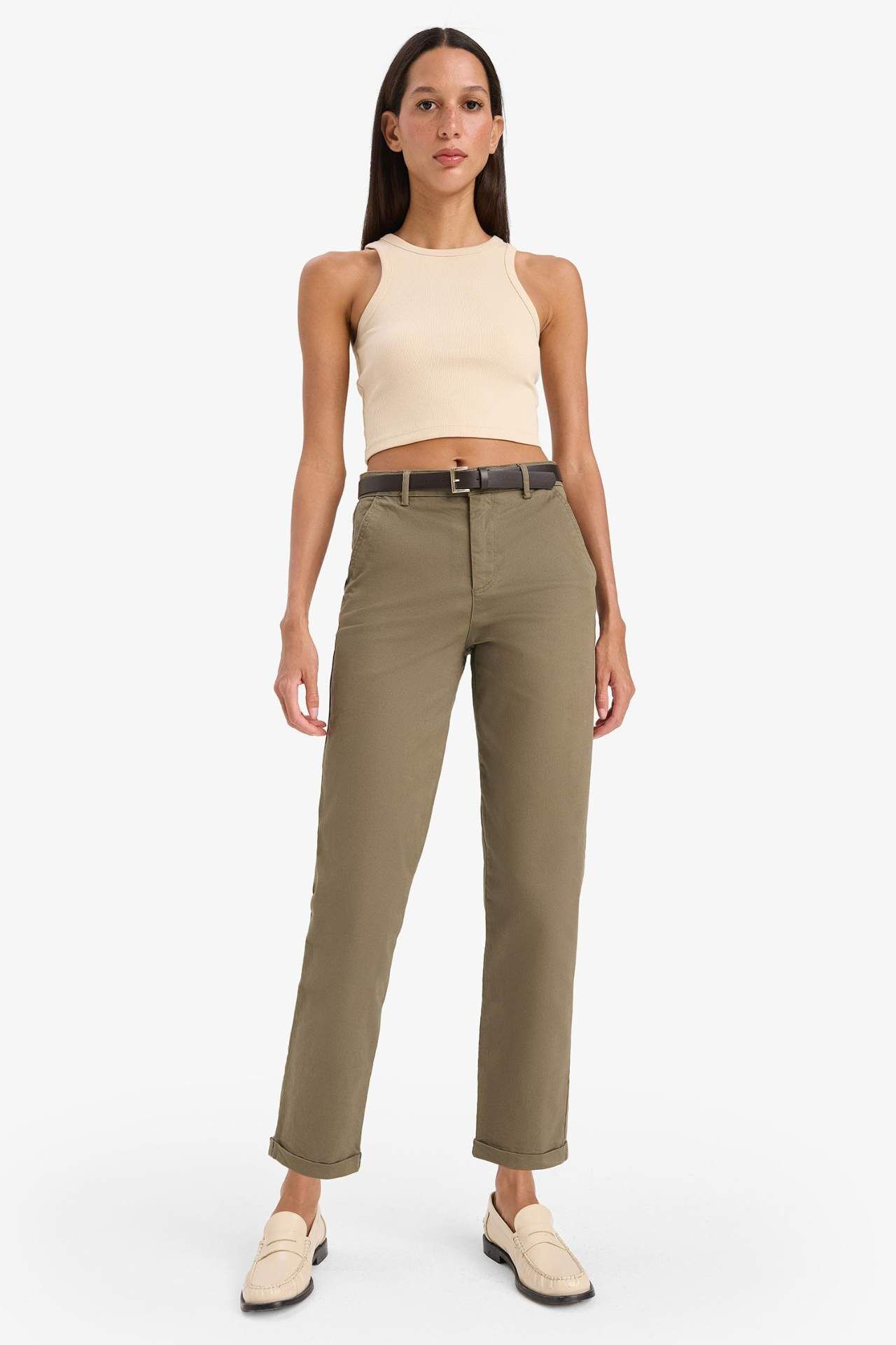 Yetişkin kadınlar için yüksek bel dokuma pantolon. Carrot fit kalıbı ve haki renk seçeneğiyle. Cepli ve kemerli detaylarla gabardin kumaştan üretilmiştir. İlkbahar/Yaz için ideal temel bir parça. Pamuk 97%,Elastan 3%,Pamuk 97%,Elastan 3%,Pamuk 97%,Elastan 3%,Pamuk 97%,Elastan 3%,Pamuk 97%,Elastan 3%,Pamuk 97%,Elastan 3% Manken Bedeni: Göğüs: 88 Boy: 1,78 Basen: 90 Bel: 60