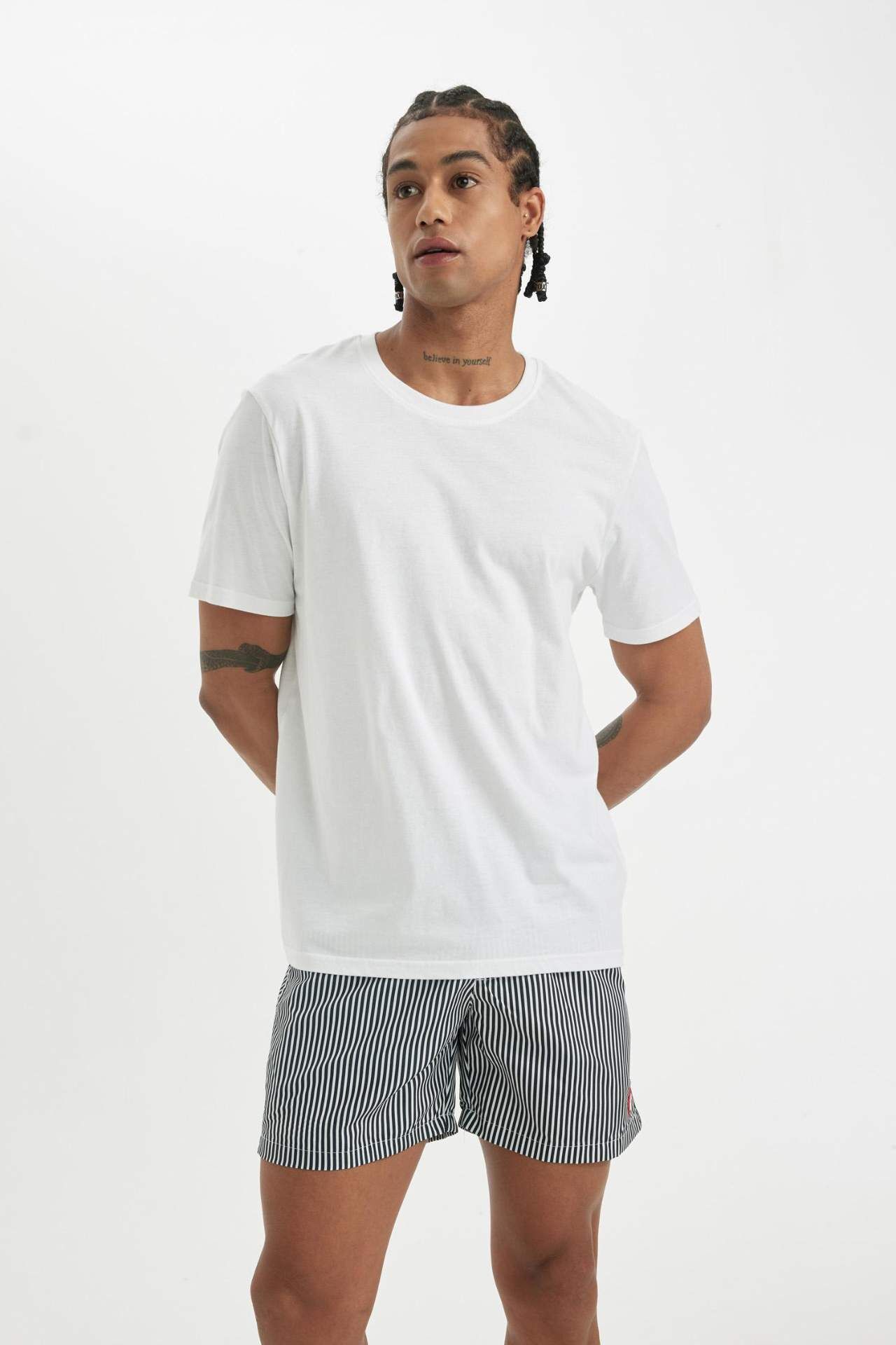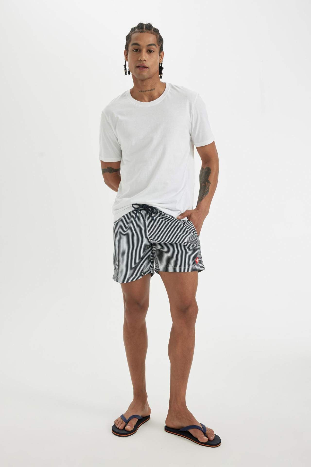 Çizgili File Astarlı Kısa Boy Deniz Şortu: Yazın stilinizi tamamlayacak şık ve konforlu bir seçenek. File astarıyla nefes alabilirlik sunarken çizgili tasarımıyla da dikkat çeker. Plajda ve havuzda özgürce hareket etmenizi sağlar. Şıklığı ve rahatlığı bir arada arayanlar için ideal bir tercih. Poliester 100%,Poliester 100%,Poliester 100%,Poliester 100% Manken Bedeni: Göğüs: 95 Boy: 1,86 Basen: 93 Bel: 74