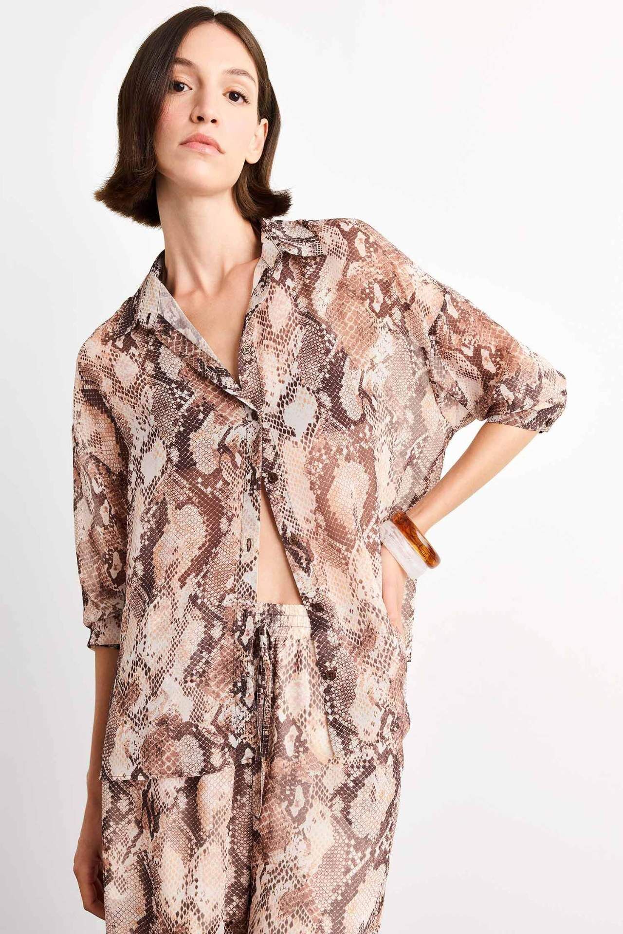 Comfort fit kesime sahip V yaka desenli şifon uzun kollu gömlek, hafif ve dökümlü yapısıyla zarif bir siluet sunar. Nefes alabilen şifon kumaşı ve şık desenleriyle hem ofis stiline hem de günlük kombinlere uyum sağlar. Poliester 100%,Poliester 100%,Poliester 100%,Poliester 100%,Poliester 100%,Poliester 100%,Poliester 100% Manken Bedeni: Göğüs: 84 Boy: 1,76 Basen: 90 Bel: 61
