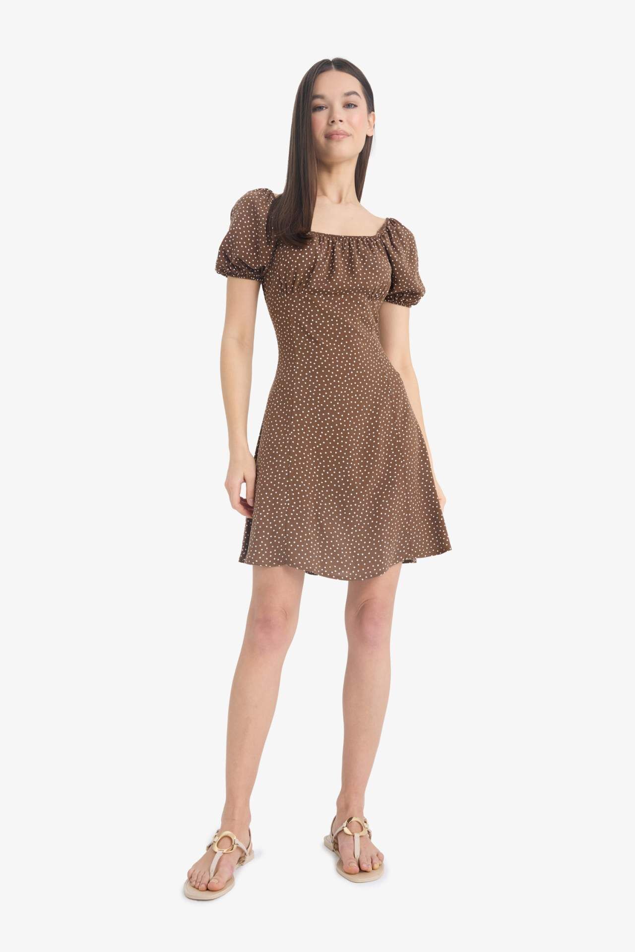 Coool A Kesim Kare Yaka Desenli Viskon Kısa Kollu Mini Elbise