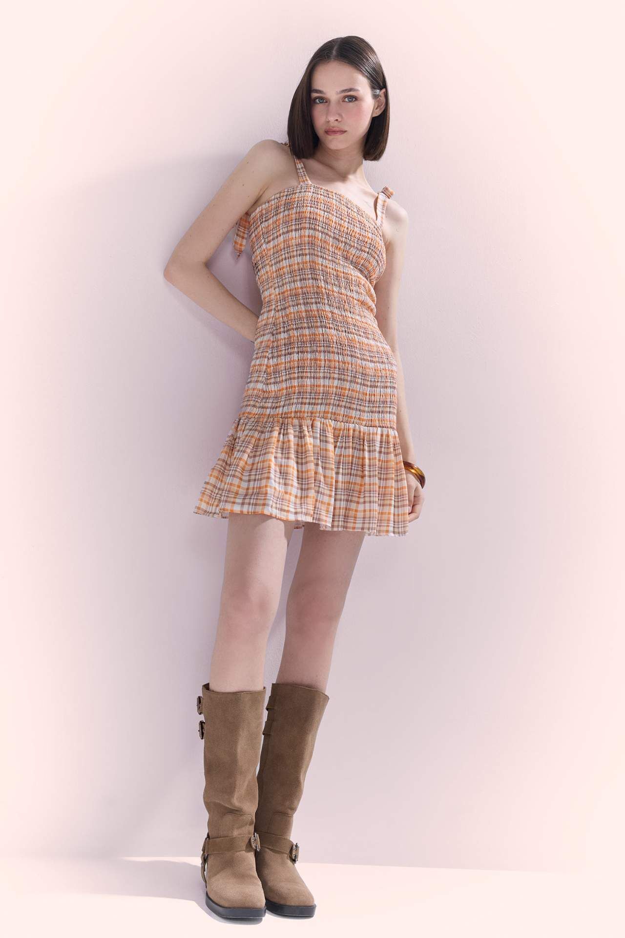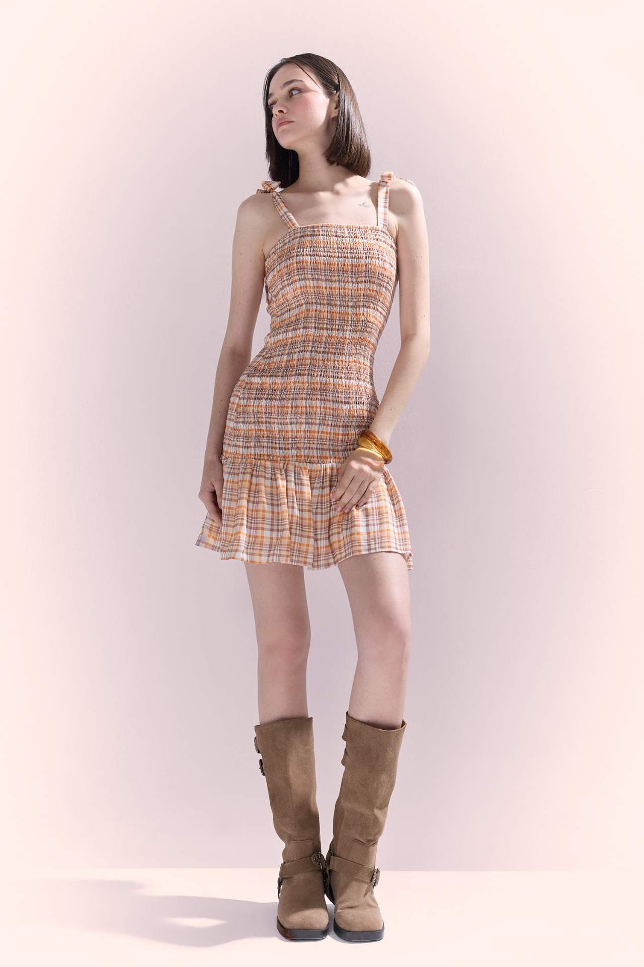 Kareli askılı mini elbise, hafif kumaşı ve canlı desenleriyle yaz kombinlerine taze bir dokunuş katar. Rahat kesimiyle gün boyu şıklık ve konfor sağlar. Viskoz 100%,Viskoz 100%,Viskoz 100%,Viskoz 100%,Viskoz 100%,Viskoz 100%,Viskoz 100% Manken Bedeni: Göğüs: 84 Boy: 1,76 Basen: 90 Bel: 61
