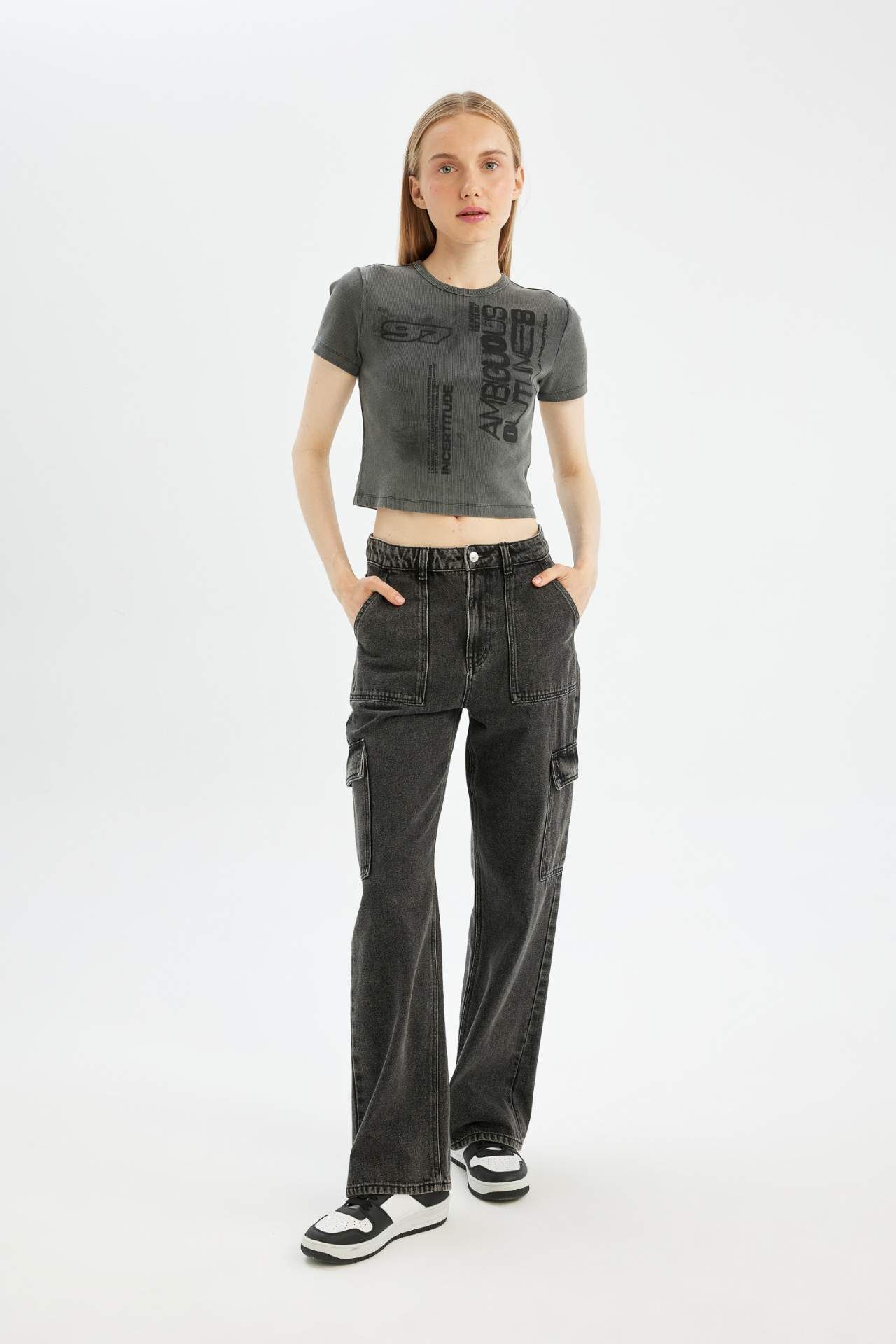 Yetişkinler için özel olarak tasarlanmış Coool markalı antrasit renkli kadın kısa kollu tişört. Fitted kalıbı ve fitilli kaşkorse kumaşı ile yaz aylarında konfor sunar. Üst beden boyu crop kesim olan bu baskılı tişört, modern ve şık bir görünüm sağlar. Bisiklet yaka detayıyla tarzınızı tamamlar. Pamuk 100%,Pamuk 100% Manken Bedeni: Göğüs: 80 Boy: 1,75 Basen: 89 Bel: 60