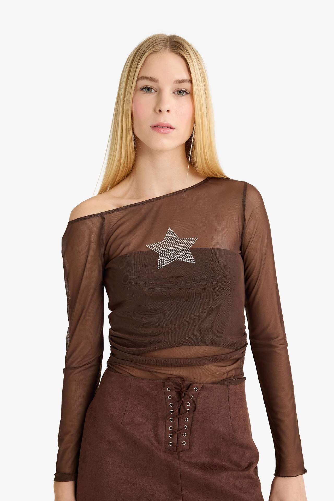 Coool Fitted Bisiklet Yaka Tül Uzun Kollu Tişört