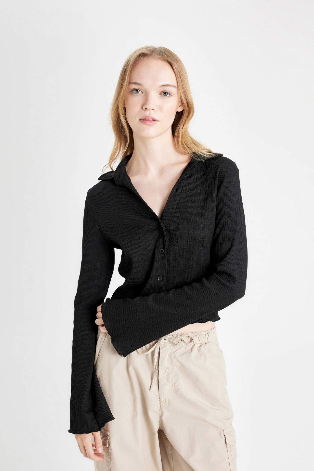 DeFacto DeFactoFit Coool Fitted Uzun Kollu Crop Gömlek A0012AX24AUBK81