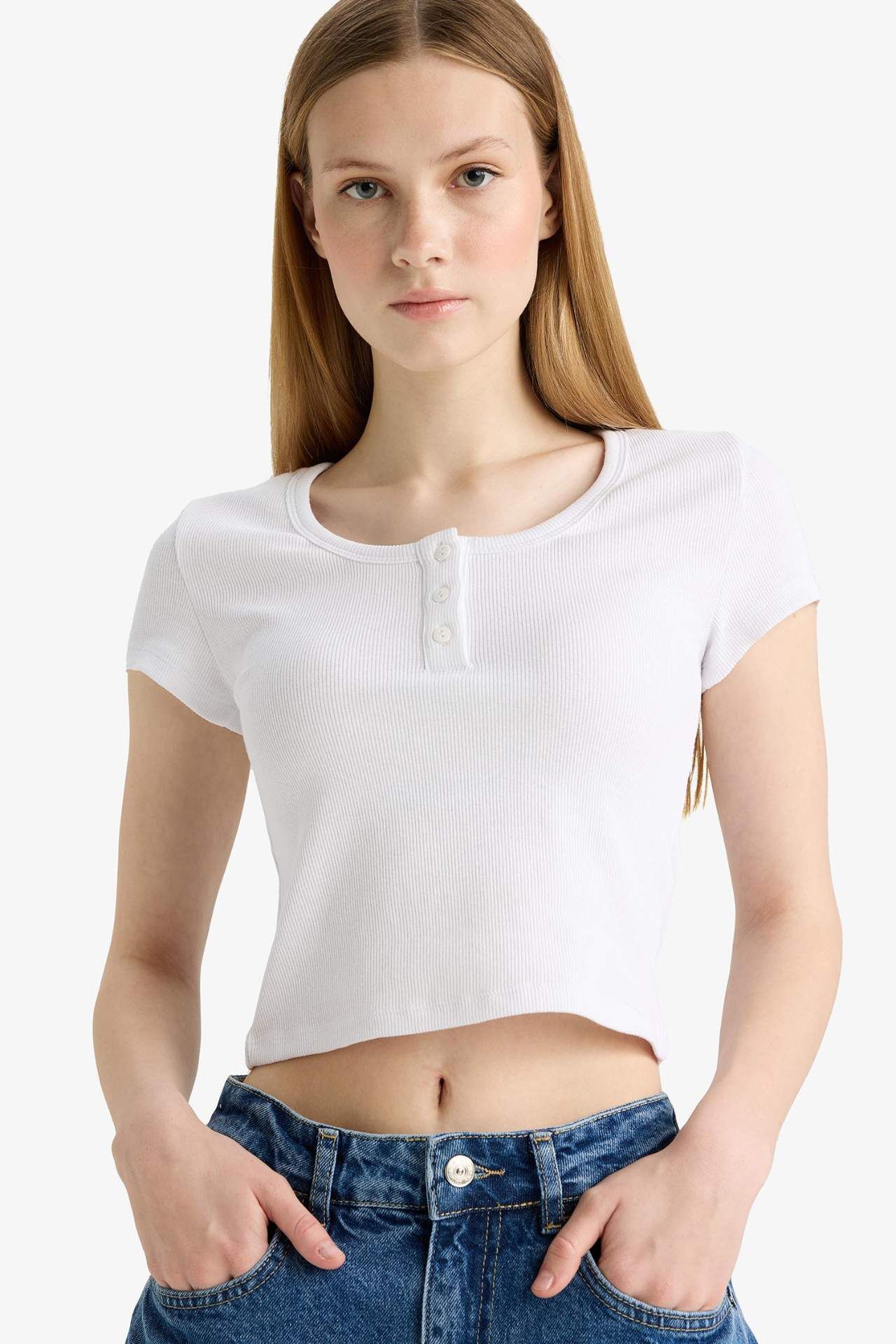 DeFacto Coool Fitted Yuvarlak Yaka Fitilli Kaşkorse Kısa Kollu Beyaz Tişört