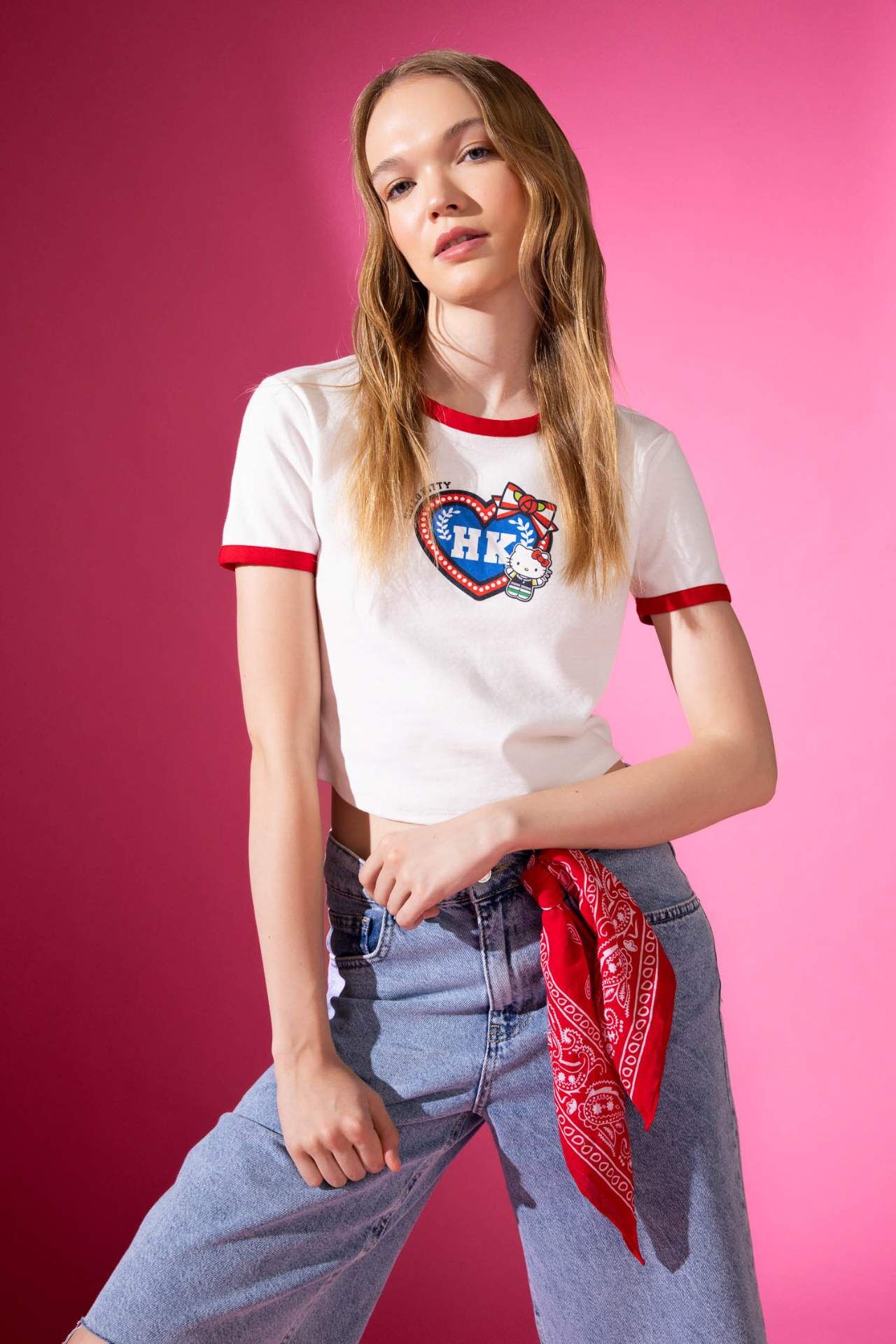 DeFactoFit Coool Hello Kitty Fitted Bisiklet Yaka Baskılı Ribana Kısa Kollu Tişört