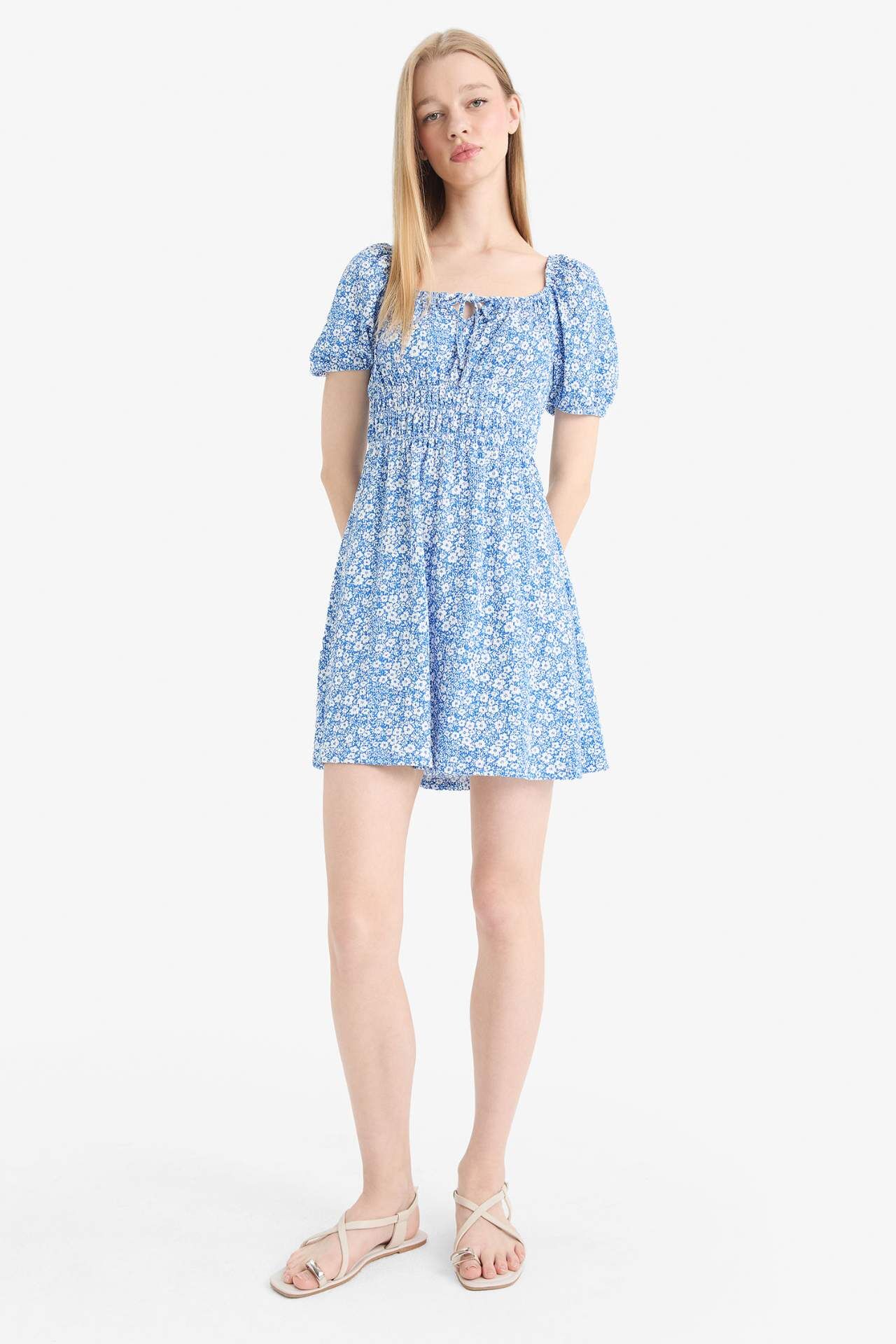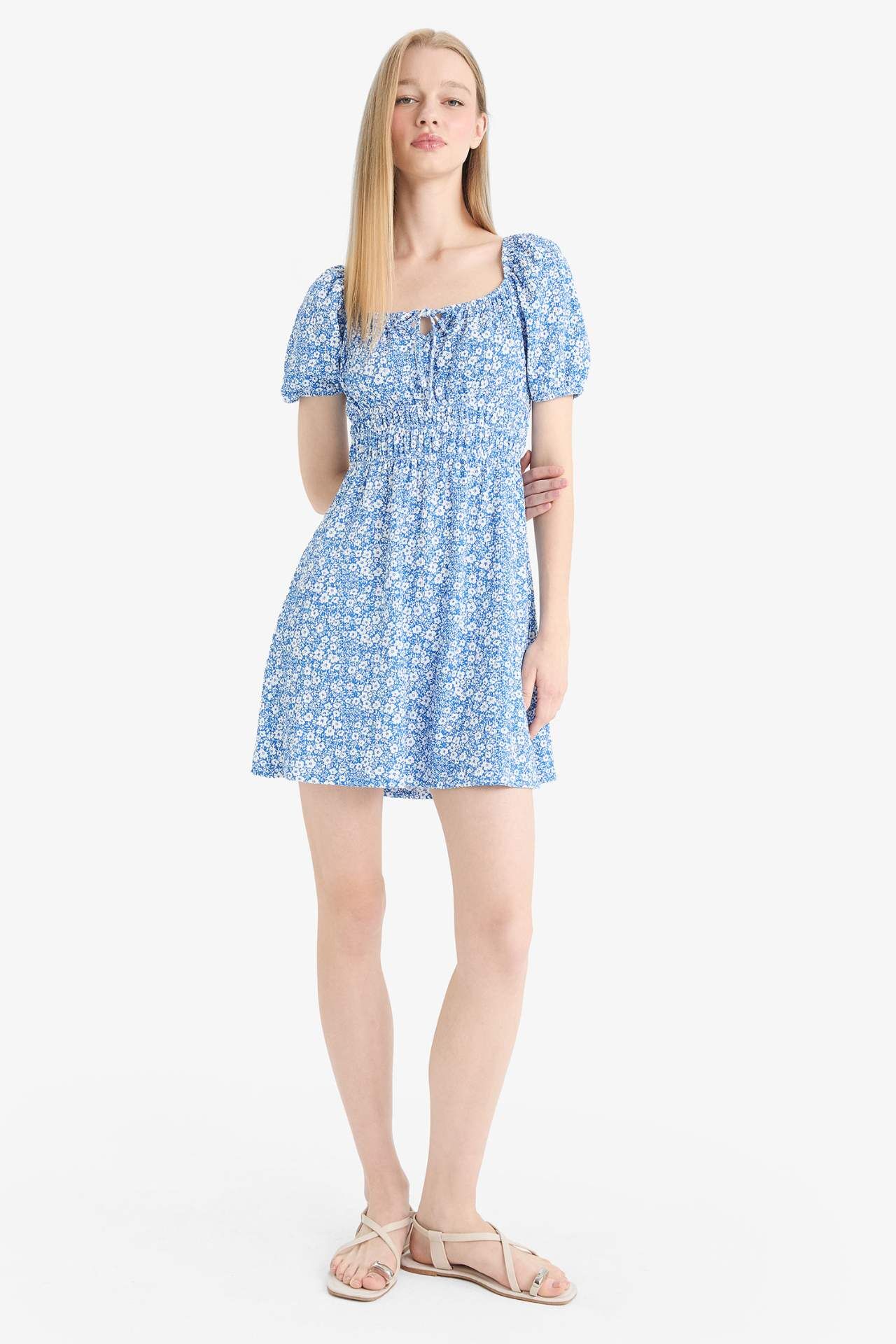 Coool Kare Yaka Çiçekli Bürümcük Kısa Kollu Mini Elbise