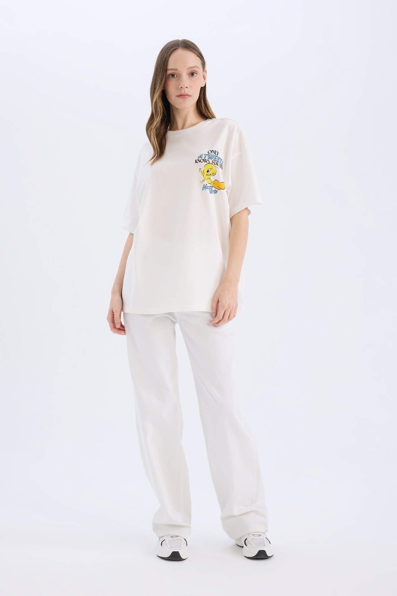 Looney Tunes oversize tişört, geniş kalıbı ve bisiklet yaka tasarımıyla rahat ve salaş bir kullanım sunar. Sırt baskısı detayıyla eğlenceli ve dikkat çekici bir stil yaratır. Günlük kombinlerde hem konforlu hem de şık bir tercih olarak öne çıkar. Pamuk 100%,Pamuk 100%,Pamuk 100%,Pamuk 100%,Pamuk 100%,Pamuk 100%
