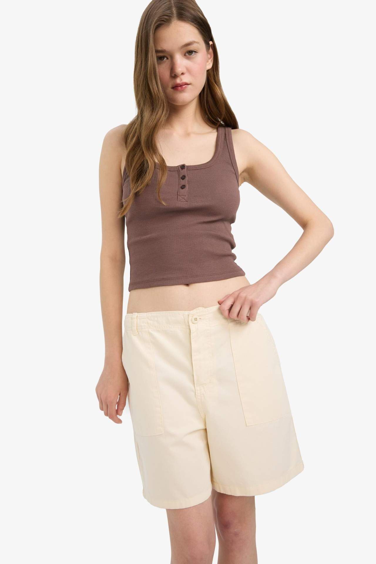 Normal Bel Kısa Paça Gabardin Şort, klasik normal beli ve rahat kesimiyle yaz gardırobunun favorisi. Dayanıklı gabardin kumaşıyla konforlu kullanım sağlar, günlük ve casual kombinlerde şık bir seçimdir. Pamuk 100%,Pamuk 100%,Pamuk 100%,Pamuk 100%,Pamuk 100%,Pamuk 100%,Pamuk 100% Manken Bedeni: Göğüs: 70 Boy: 1,77 Basen: 86 Bel: 59