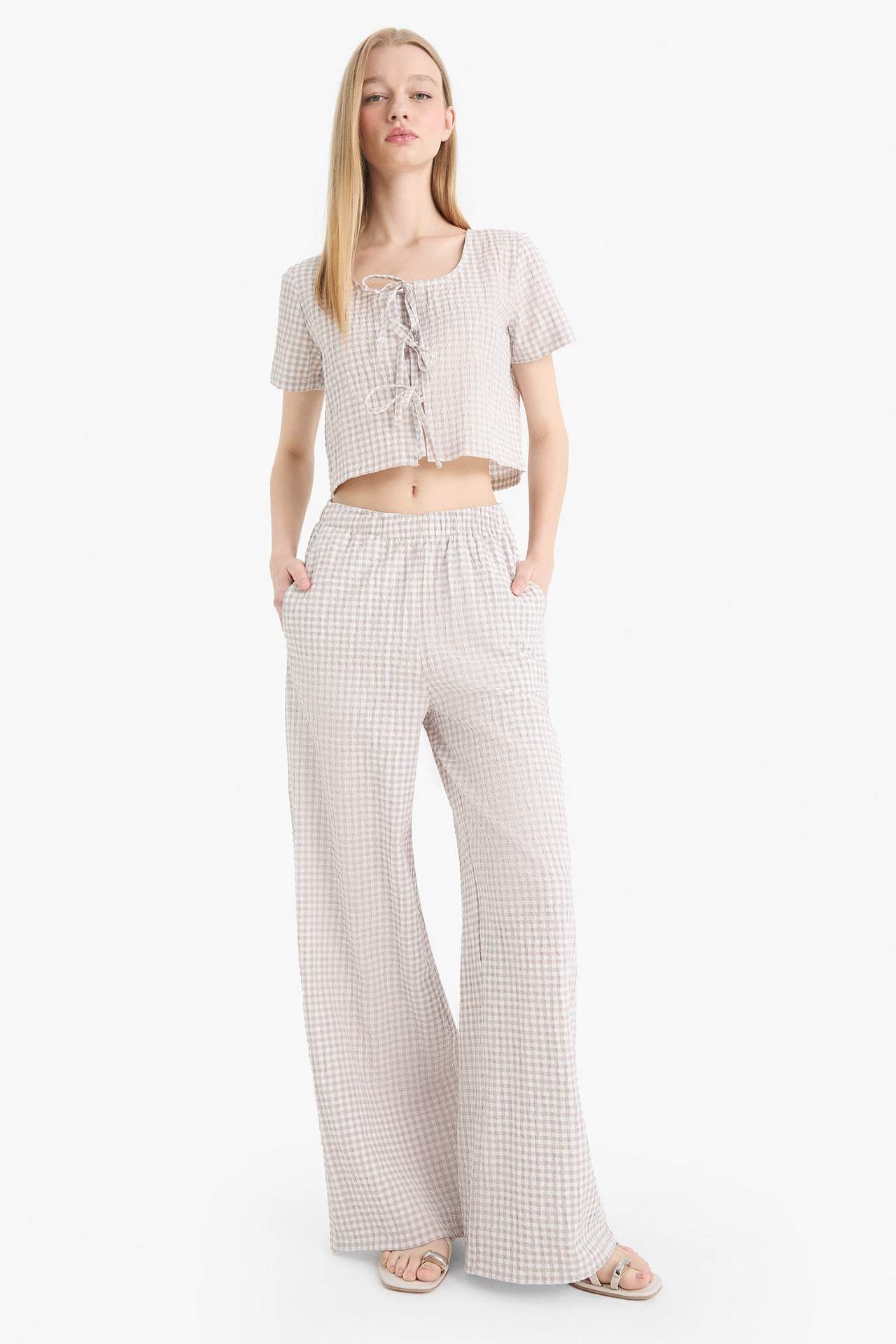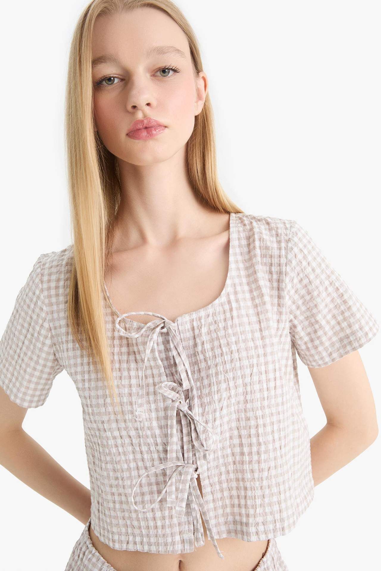V yaka önden bağlamalı kareli krinkıl kumaş kısa kollu bluz, hafif ve dokulu yapısıyla şık bir görünüm sunar. Rahat kesimi sayesinde günlük kombinlerde konforlu bir kullanım sağlar. Pamuk 59%,Elastan 2%,Poliester 39%,Pamuk 59%,Elastan 2%,Poliester 39%,Pamuk 59%,Elastan 2%,Poliester 39%,Pamuk 59%,Elastan 2%,Poliester 39%,Pamuk 59%,Elastan 2%,Poliester 39%,Pamuk 59%,Elastan 2%,Poliester 39% Manken Bedeni: Göğüs: 81 Boy: 1,8 Basen: 90 Bel: 59