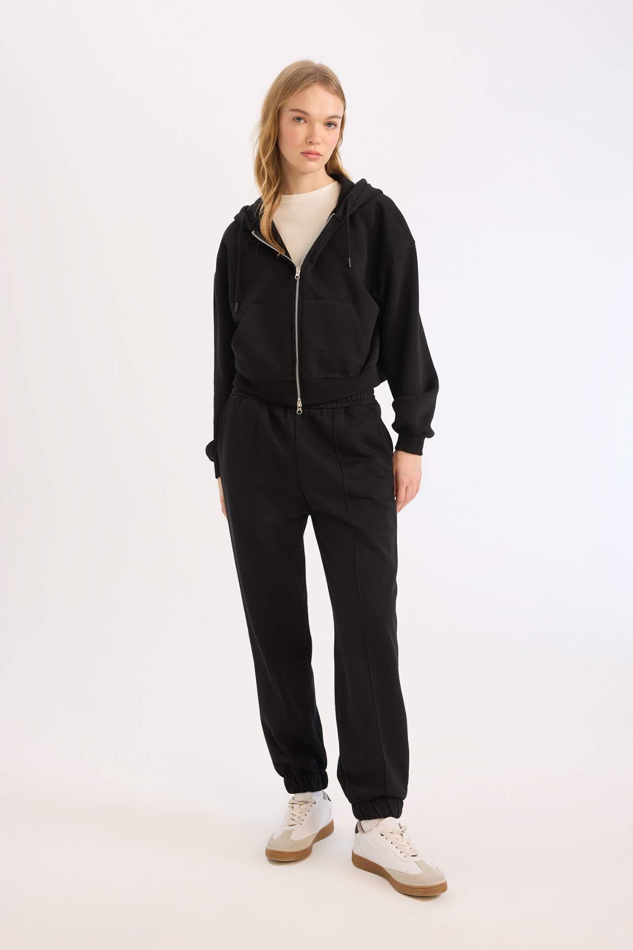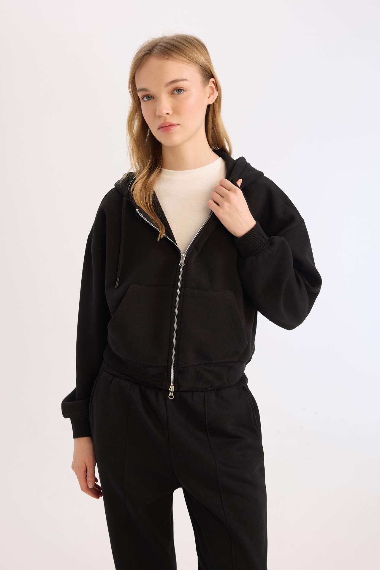 Coool Standart Fit Kapüşonlu Basic Düz Kanguru Cepli Fermuarlı Sweatshirt Z7069AZ25SPBK81