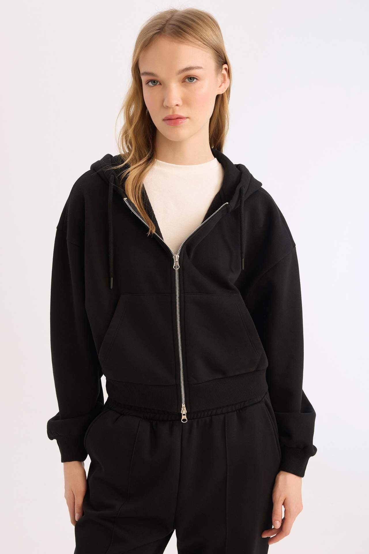 DeFacto Coool Standart Fit Kapüşonlu Basic Düz Kanguru Cepli Fermuarlı Sweatshirt Z7069AZ25SPBK81