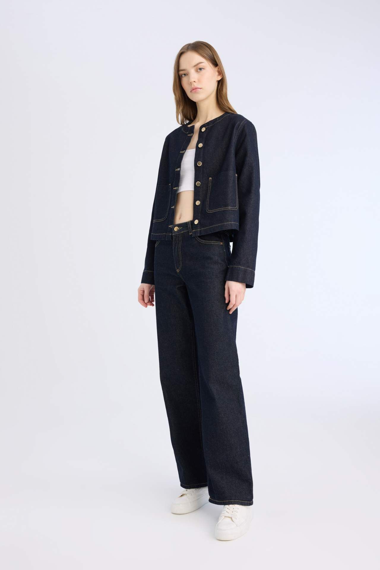 Crop kesimi ve düğmeli cepli tasarımıyla modern bir siluet sunan denim ceket, rahat yapısıyla günlük kombinlerde şıklığı tamamlar. Zamansız ve çok yönlü tasarımıyla gardırobun favori parçası olur. Pamuk 100%,Pamuk 100%,Pamuk 100%