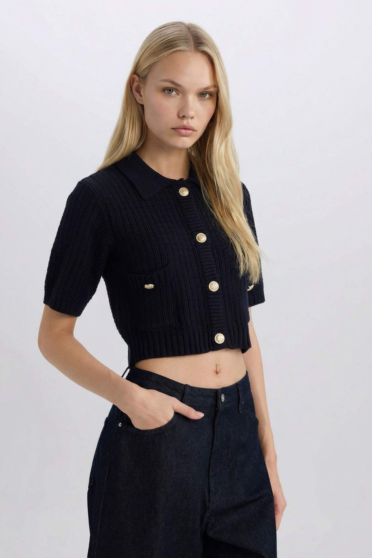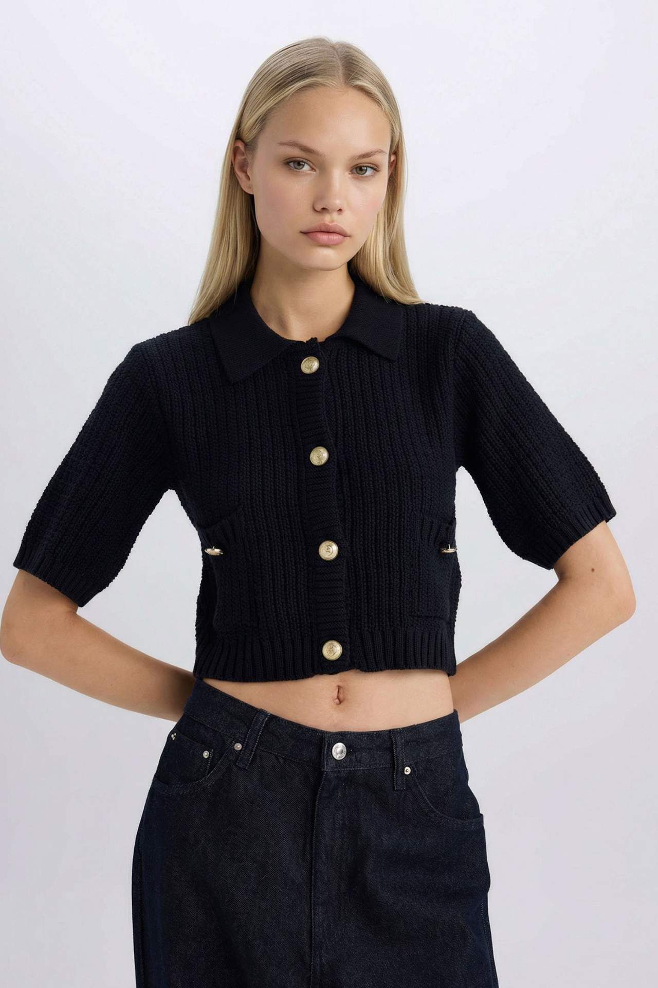DeFacto Cropped Fit Gömlek Yaka Hırka E1977AX24WNNV134