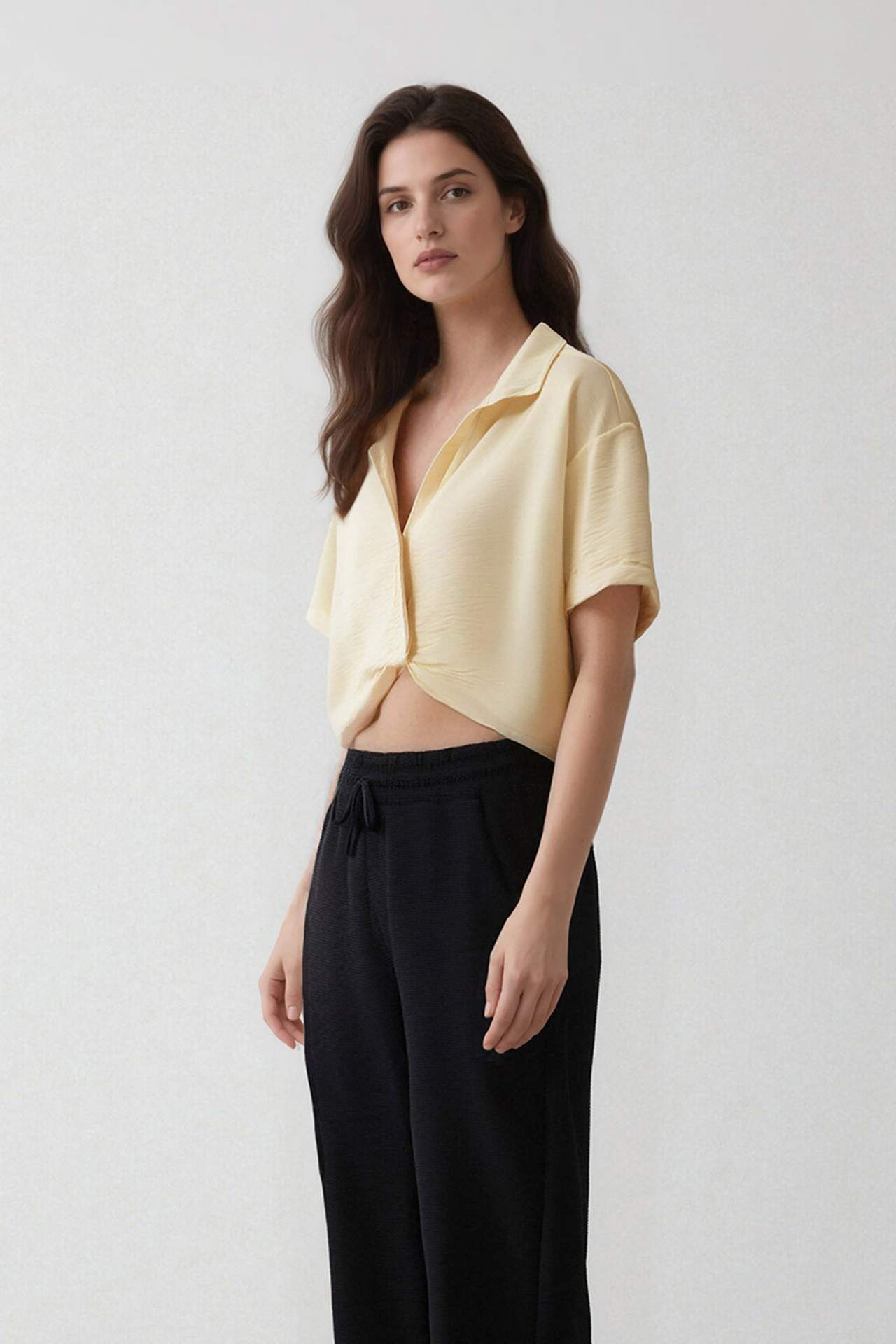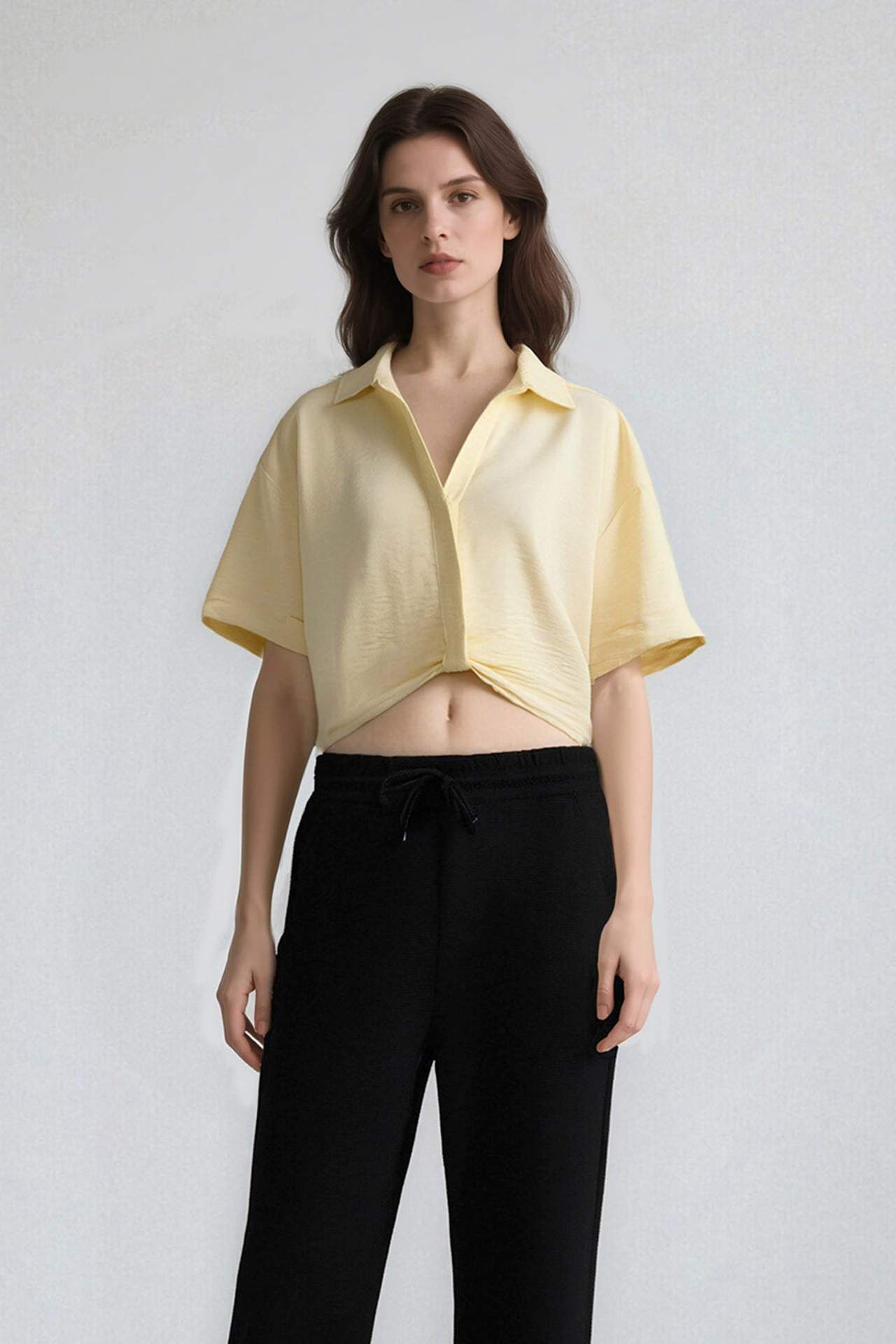 Cropped Fit Gömlek Yaka Keten Görünümlü Kısa Kollu Bluz