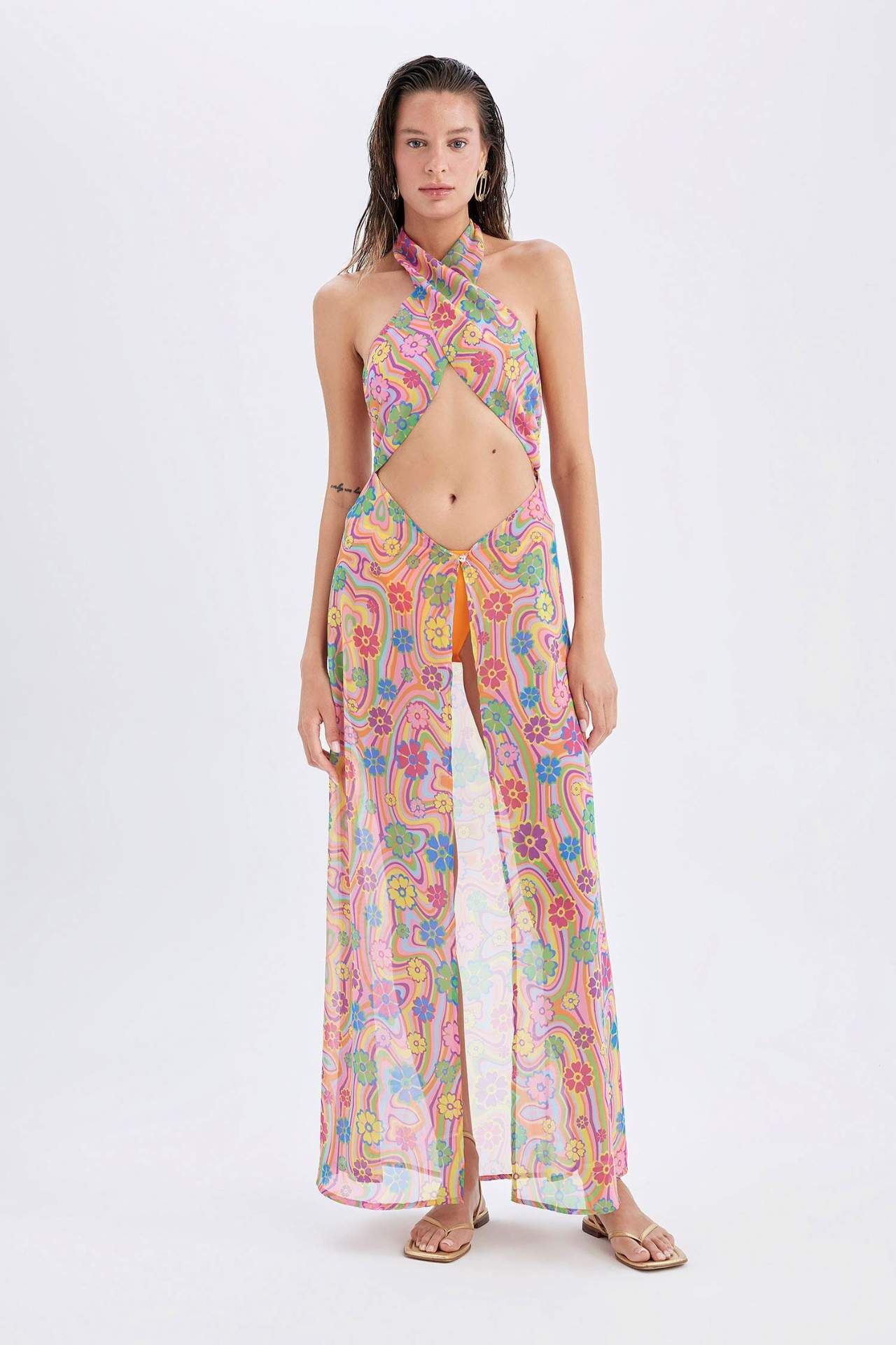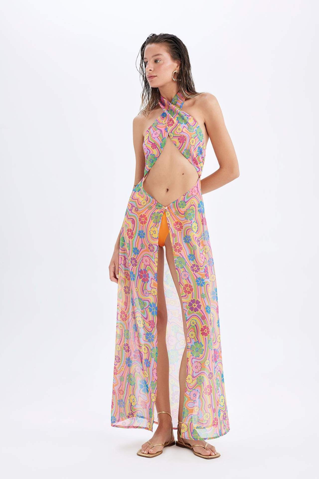 Declara x DeFacto Desenli Boyundan Bağlamalı Şifon Maxi Plaj Elbisesi