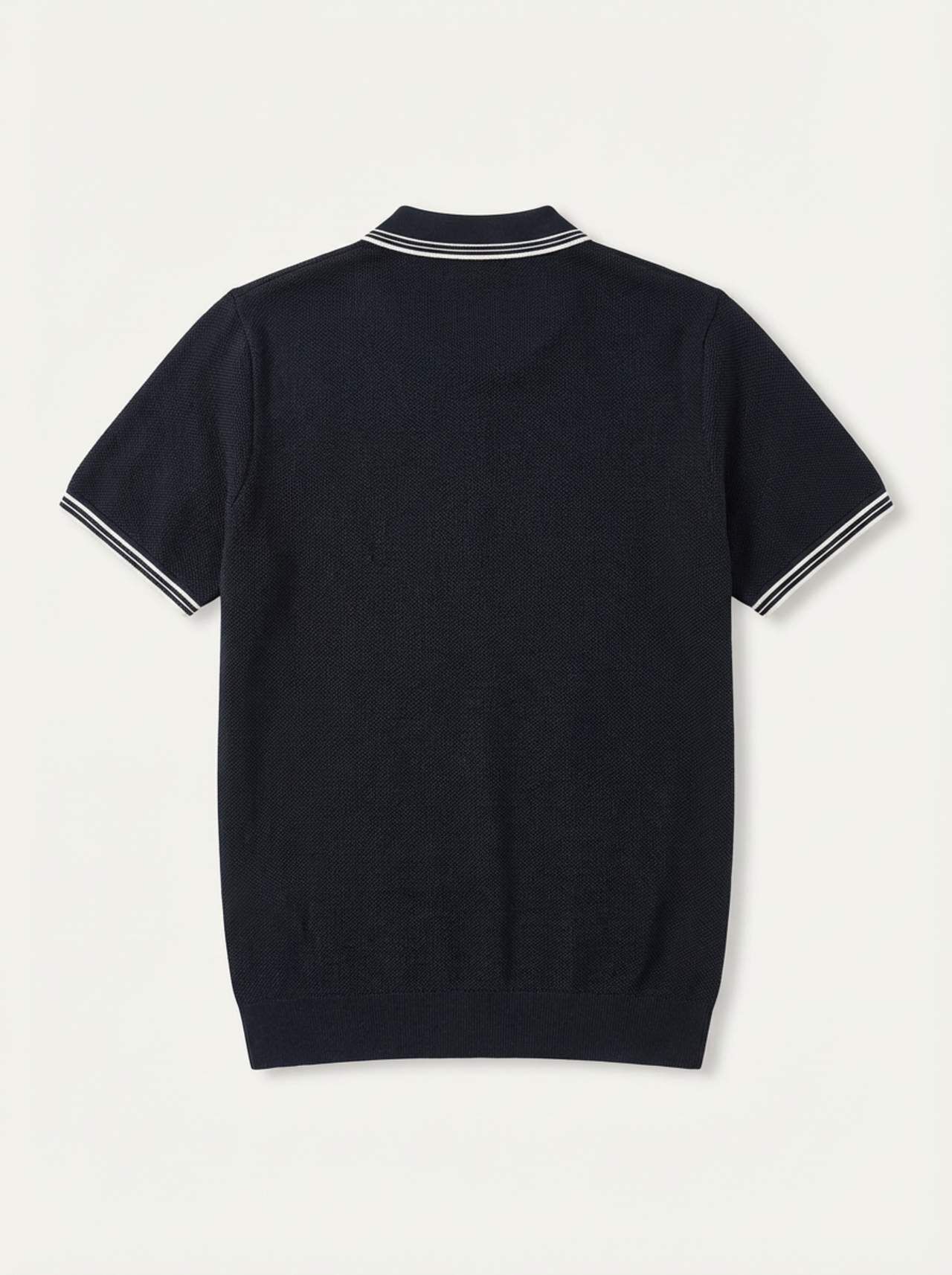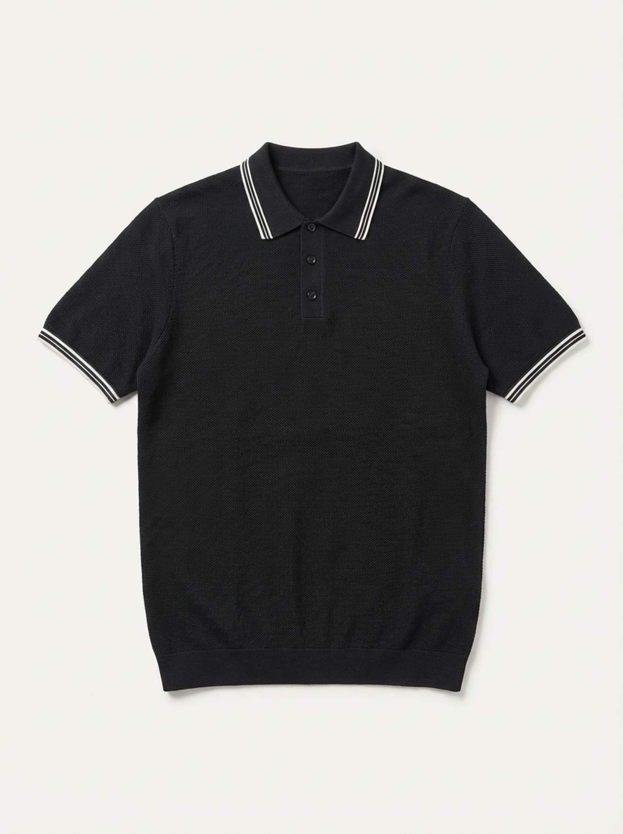 Polo yaka, kısa kollu tişört. Üç düğmeli patlet ve ribanalı yaka, manşet ve etek ucu. Yaka ve manşetlerde çift şerit detayı. Pamuk 100%