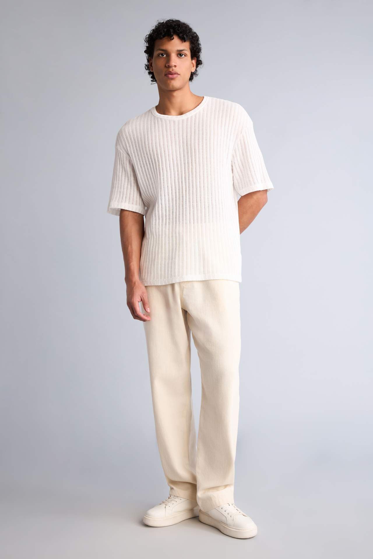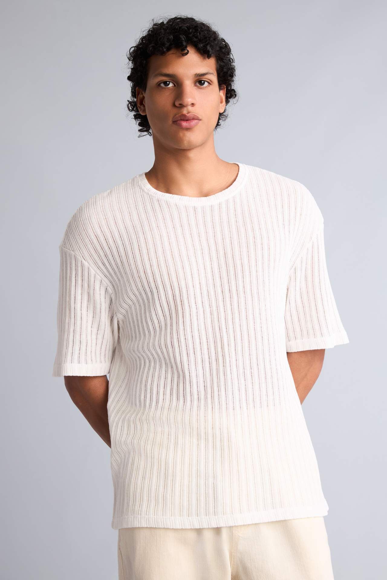 Kısa kollu, bisiklet yakalı, örgülü tişört. Pamuk 50%,Poliester 50% Manken Bedeni: Göğüs: 98 Boy: 1,84 Basen: 96 Bel: 78
