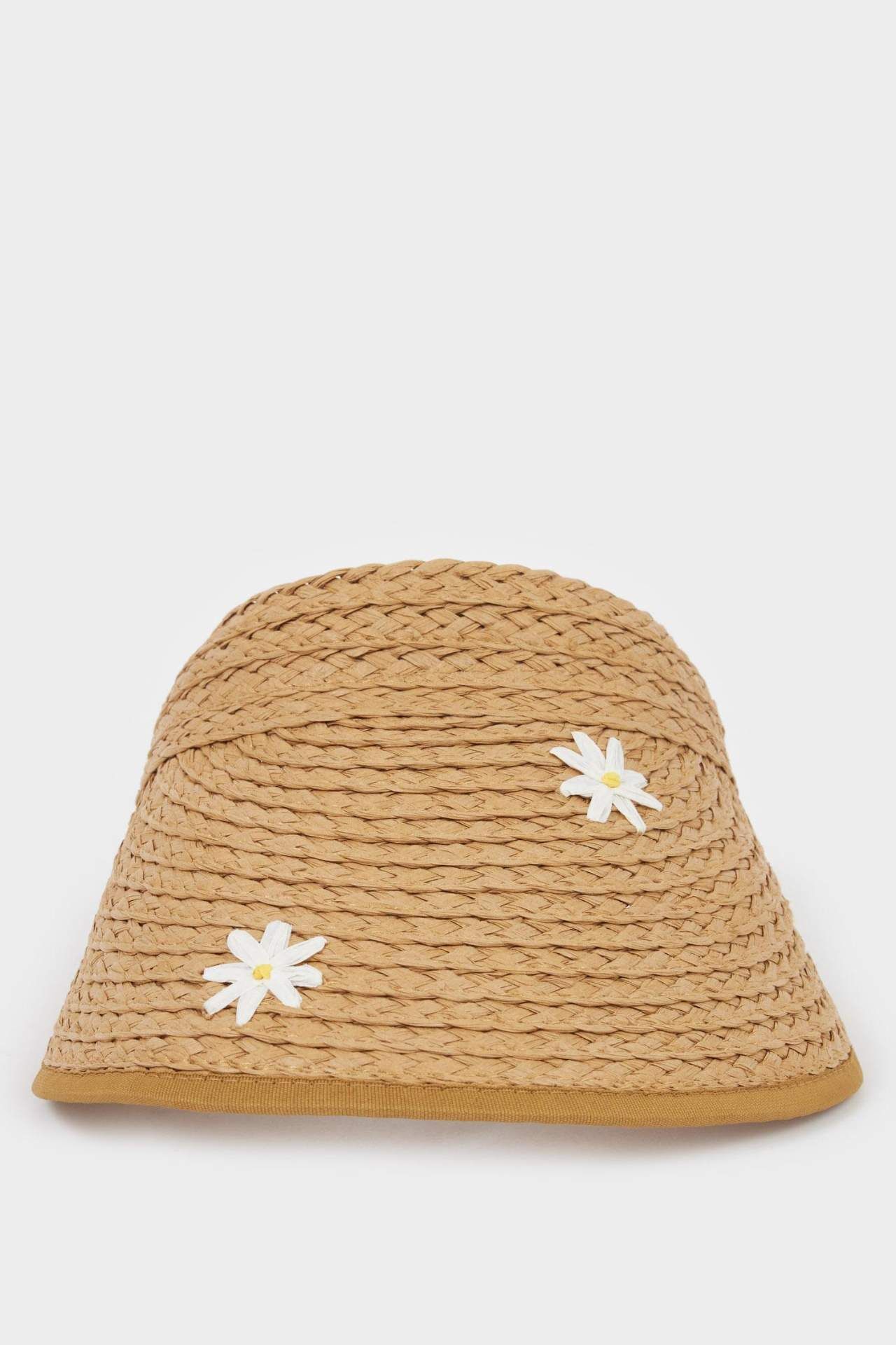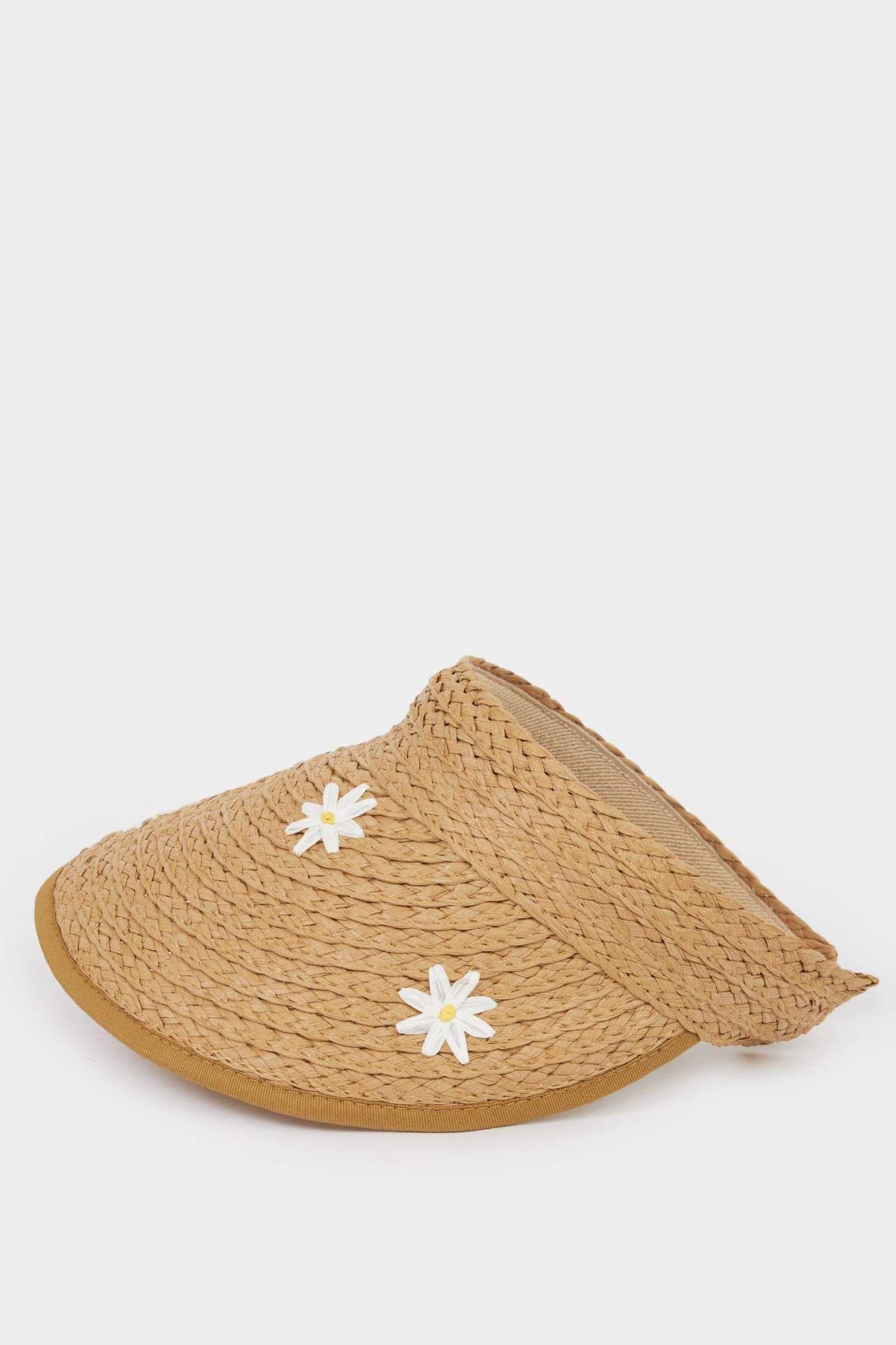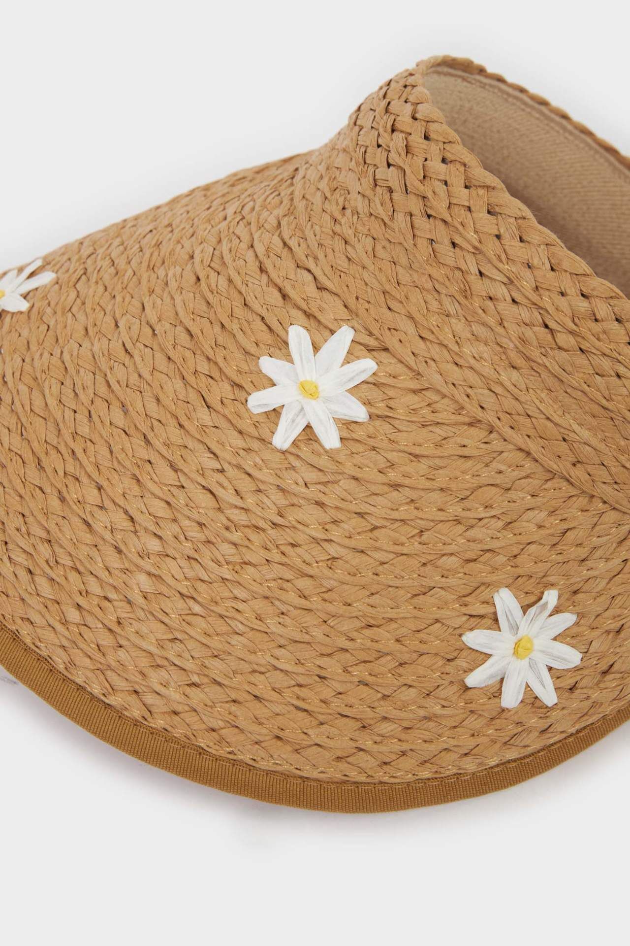 Hasır 3D çiçek desenli vizör şapka, kadınlar için bej renkte ve 56 cm boyutunda. İlkbahar/Yaz mevsimi için ideal bir aksesuar. Kağıt 100%