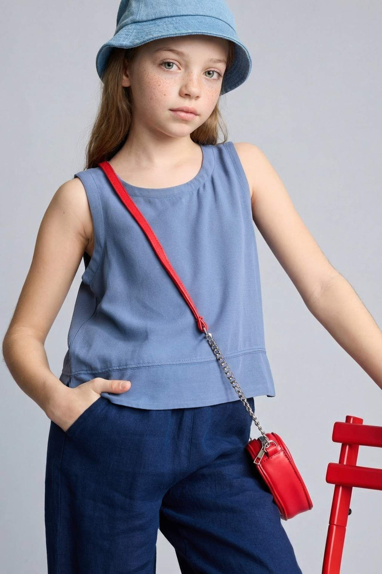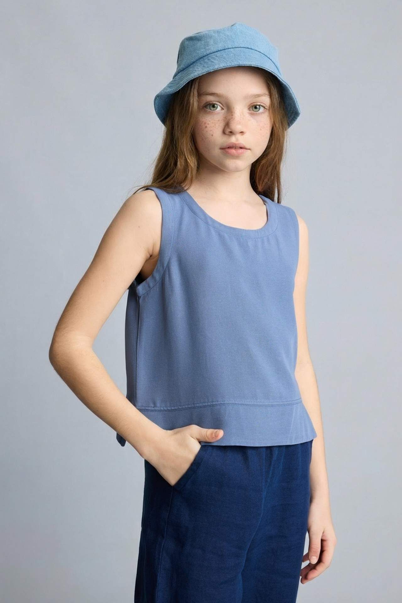 Kız çocuklar için yaz aylarına uygun, keten karışımlı indigo bluz. Kısa ve regular fit yapısıyla konforlu ve şık bir seçenek. Her zaman şıklık arayan dokuma üst alışverişçilerinin tercihi. Viskoz 85%,Keten 15% Manken Bedeni: Göğüs: 62 Boy: 1,24 Basen: 73 Bel: 53