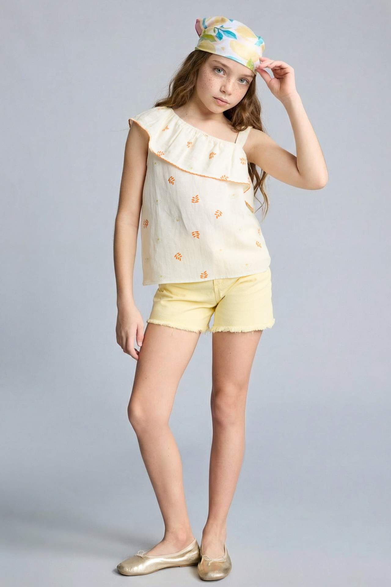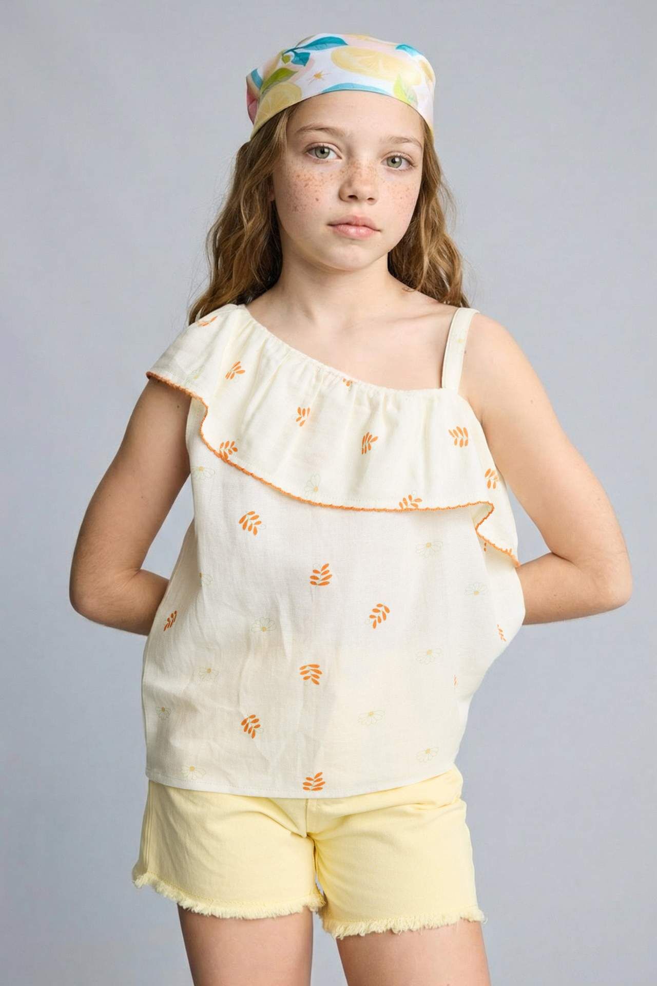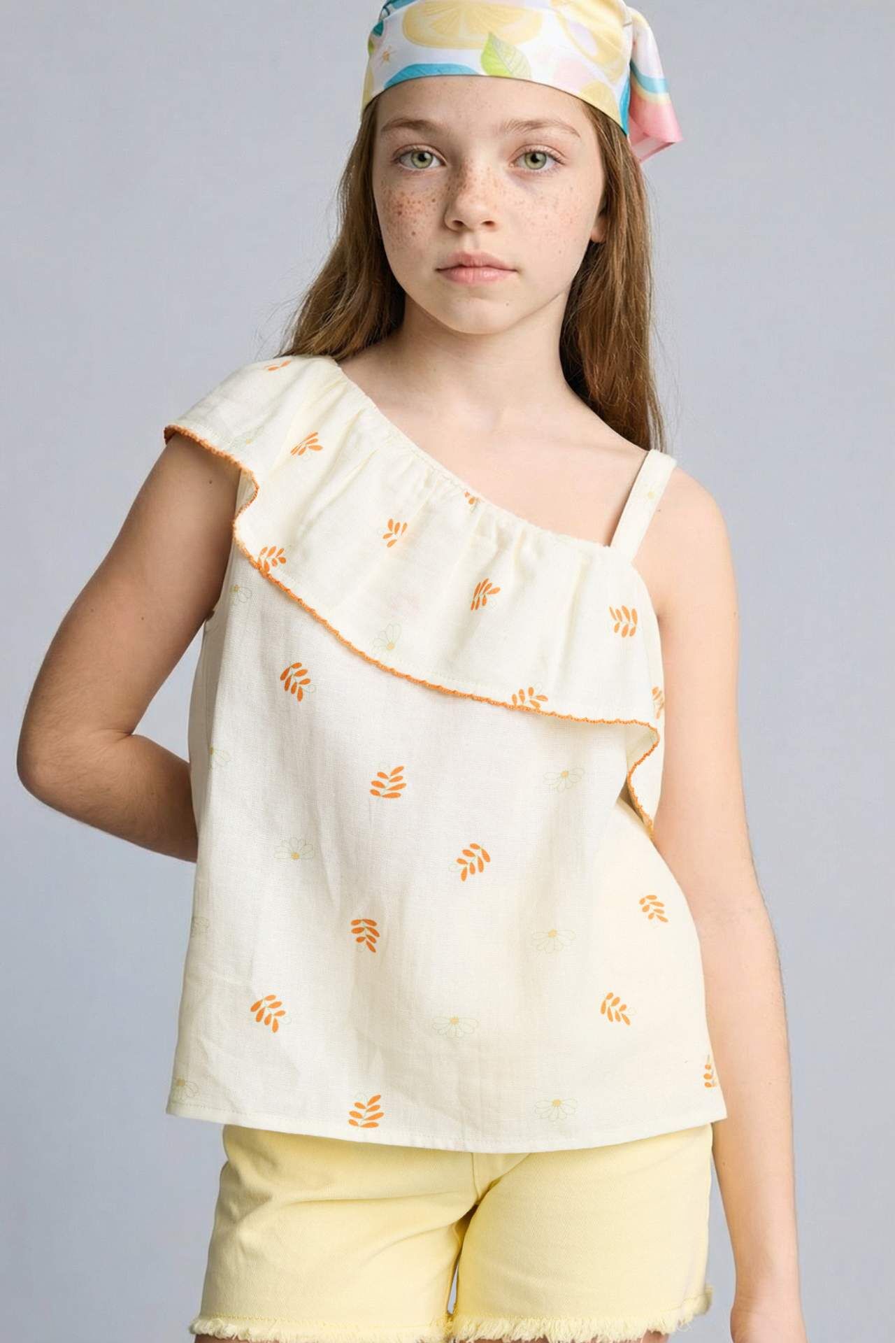 Keten karışımlı Ekru renkli kolsuz kısa kollu bluz, İlkbahar/Yaz için ideal bir seçimdir. Temel çeşit içinde yer alan bu ürün, Kız Çocuklar için tasarlanmıştır. Kaliteli kumaşı ve şık tasarımıyla dikkat çeker. Her dokunuşta stilinizi yansıtacak. Pamuk 46%,Viskoz 46%,Keten 8% Manken Bedeni: Göğüs: 62 Boy: 1,24 Basen: 73 Bel: 53