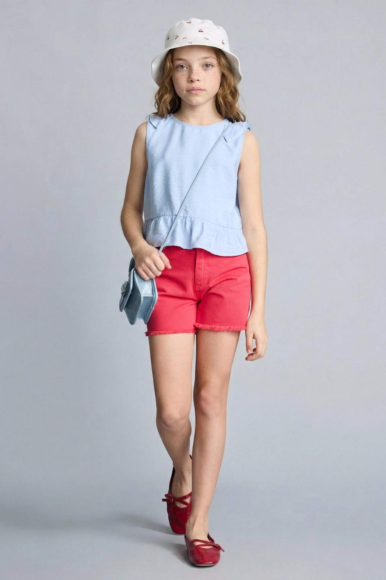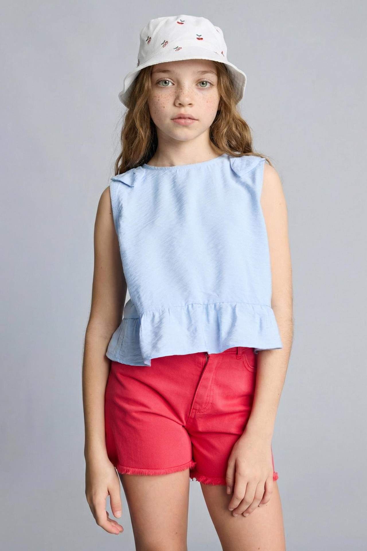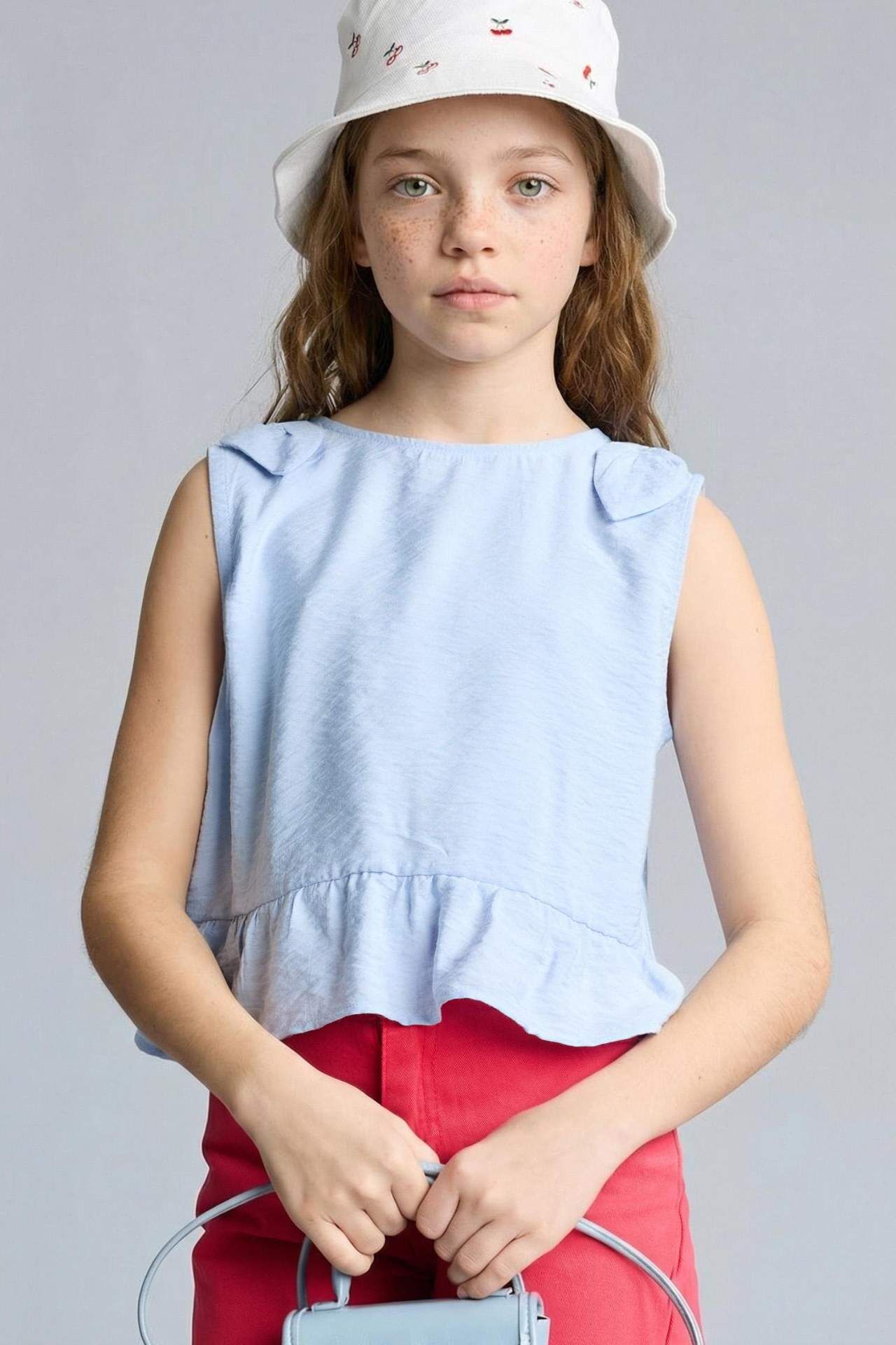 Kız çocukları için ideal bir seçim olan mavi krinkıl kumaştan yapılmış kısa kollu bluz. İlkbahar/Yaz koleksiyonumuzun temel parçalarından biri. Poliamid 12%,Viskoz 88% Manken Bedeni: Göğüs: 62 Boy: 1,24 Basen: 73 Bel: 53