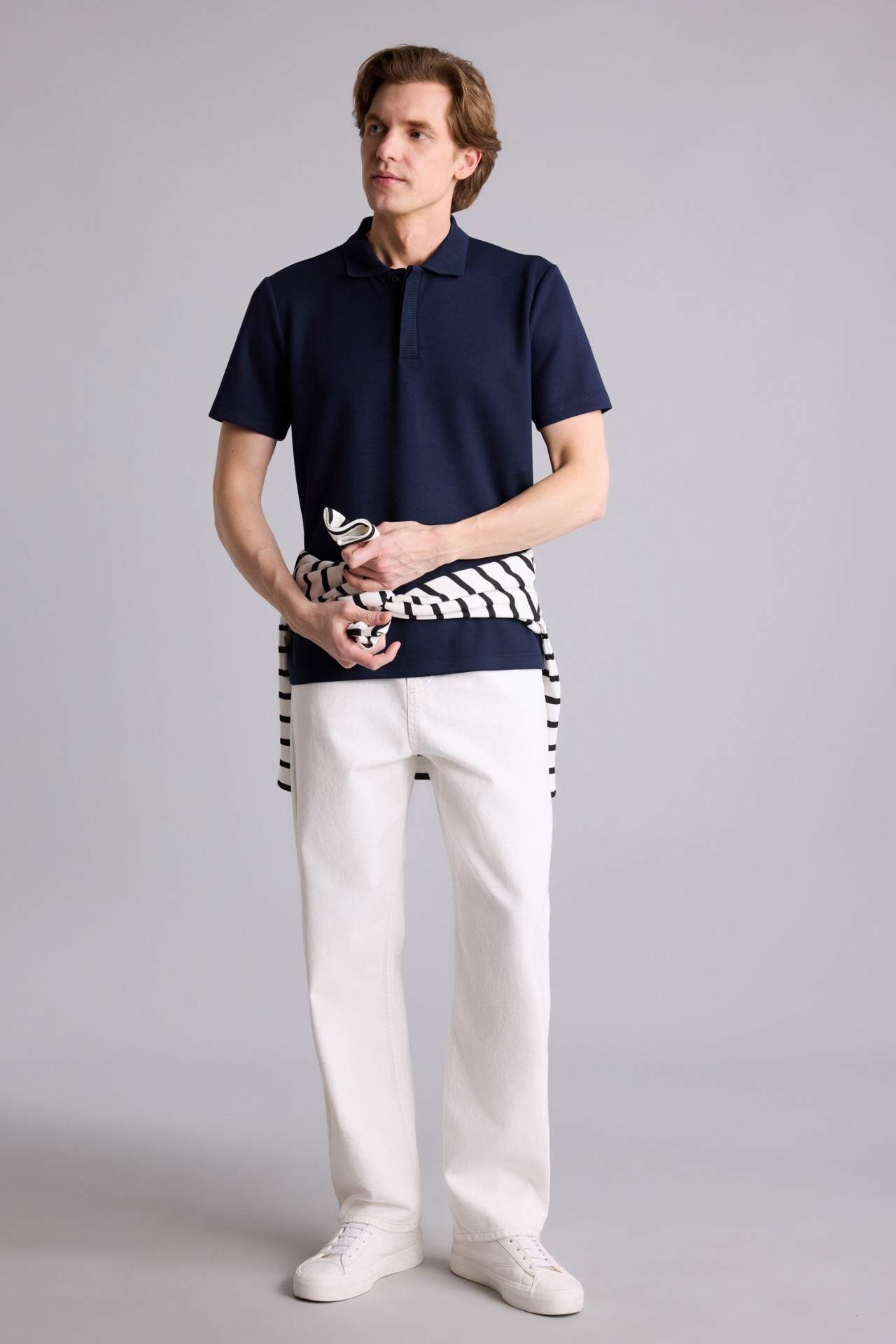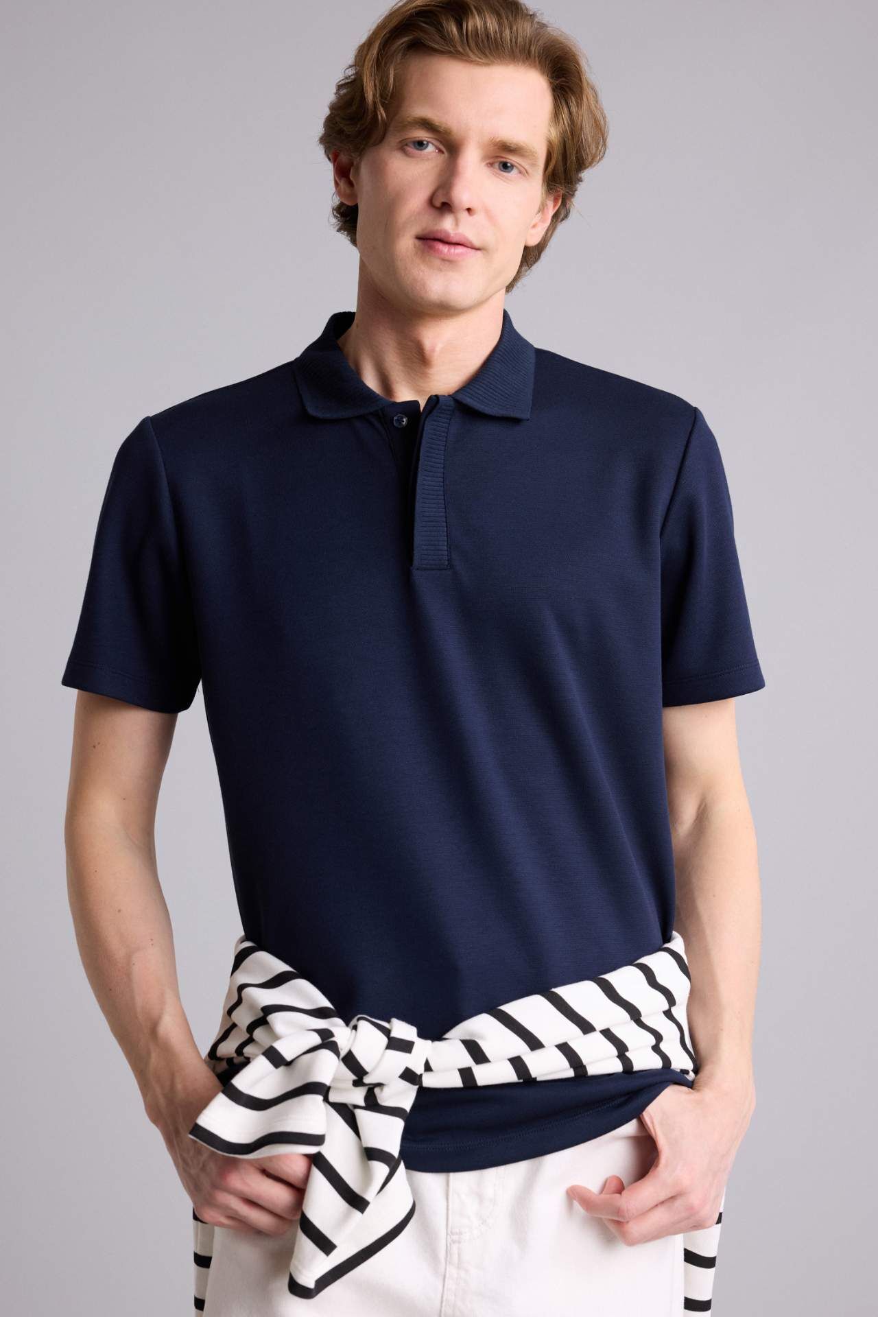 Yetişkin erkekler için örme pamuklu lacivert kısa kollu polo tişört. Patlı yaka trikoludur ve regular fit kalıba sahiptir. Sonbahar/Kış sezonu için ideal temel bir parça. Elastan 5%,Viskoz 41%,Poliester 54% Manken Bedeni: Göğüs: 98 Boy: 1,86 Basen: 99 Bel: 78