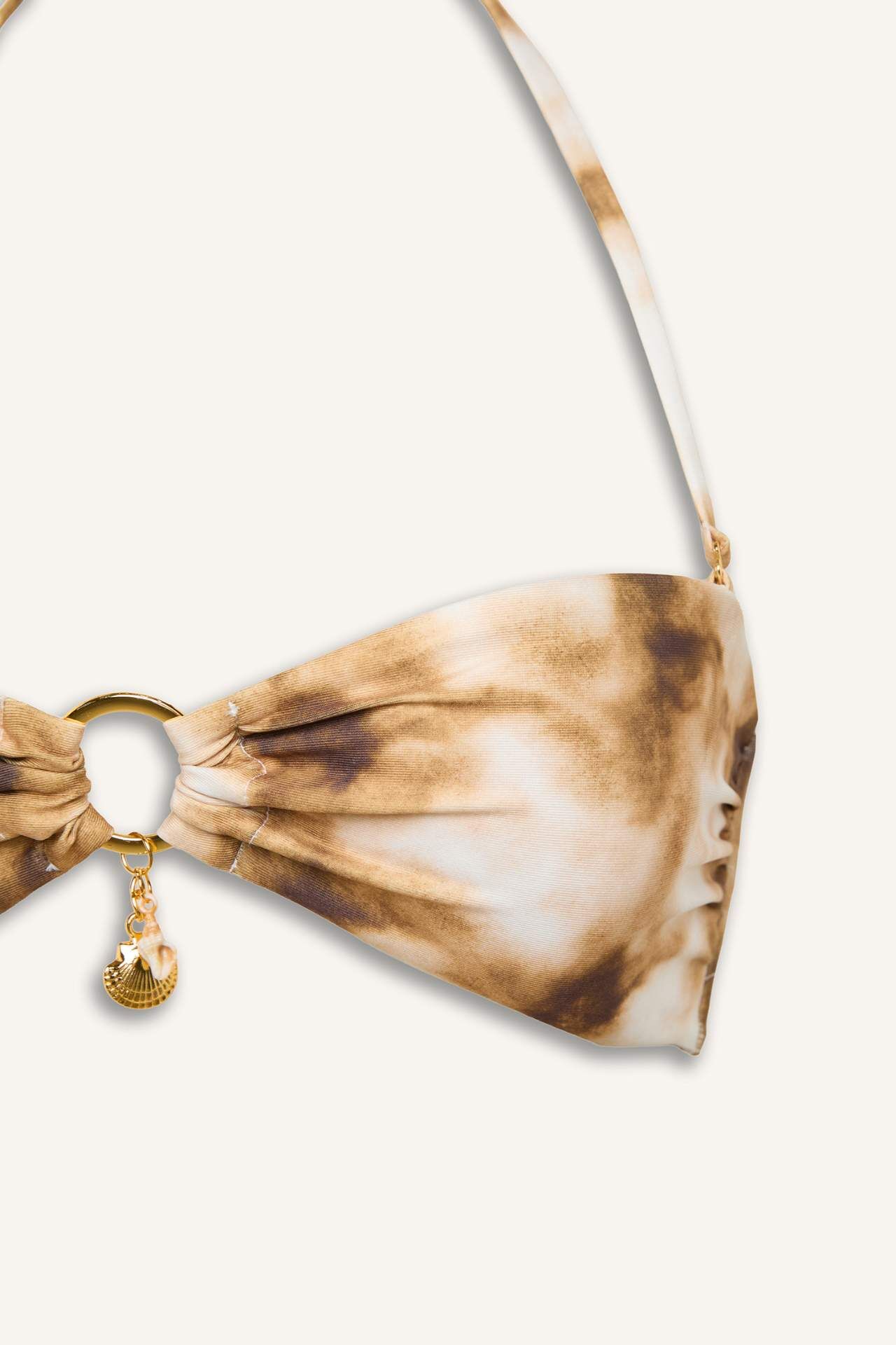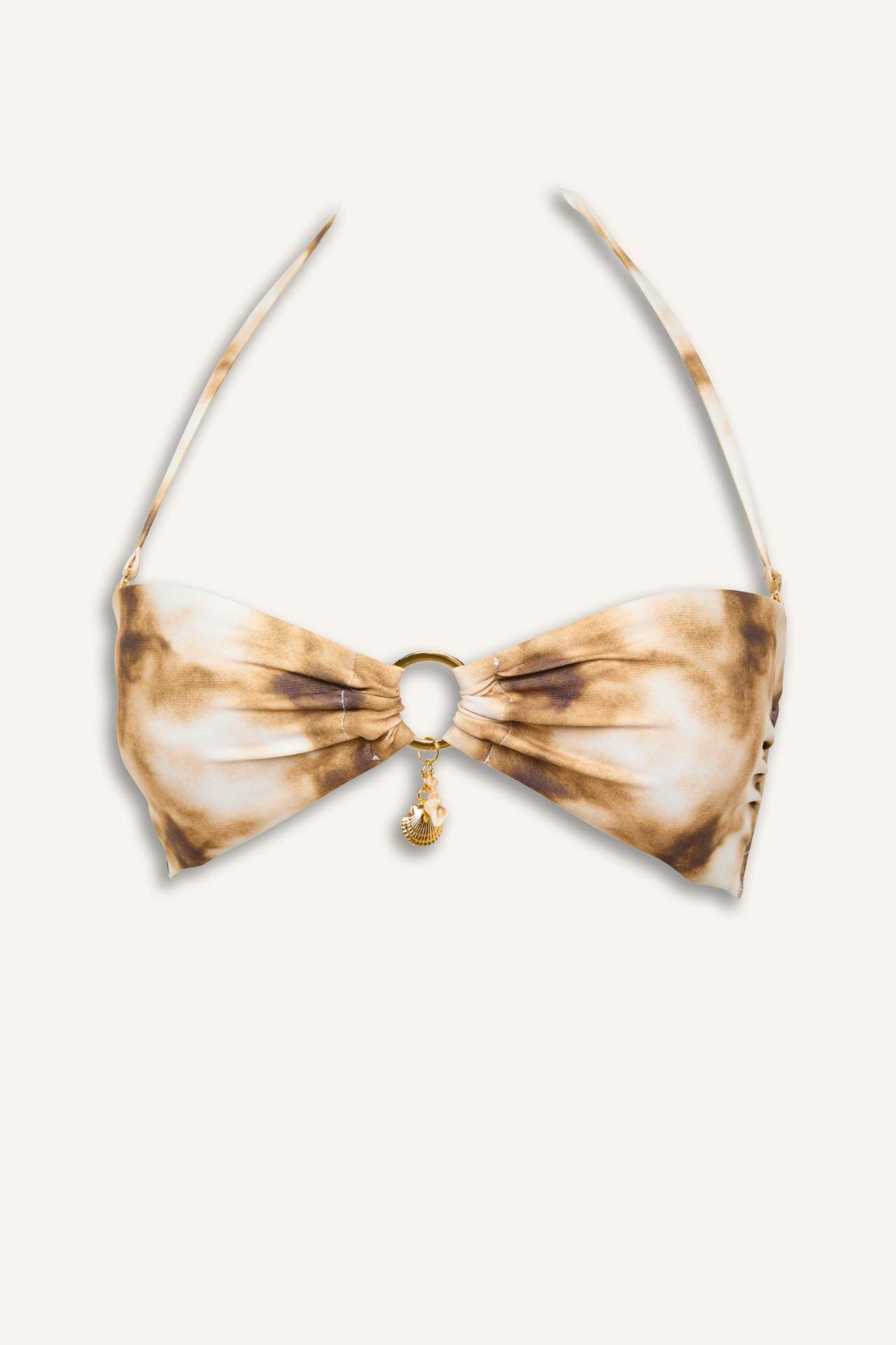 Regular fit batik desenli bikini üstü. Halter yaka. Ön kısımda ortadan büzgü detayı, metal halka ve sallanan metal süs detaylı. Ense bağlamalı. Elastan 8%,Poliester 92%,Elastan 15%,Poliester 85%