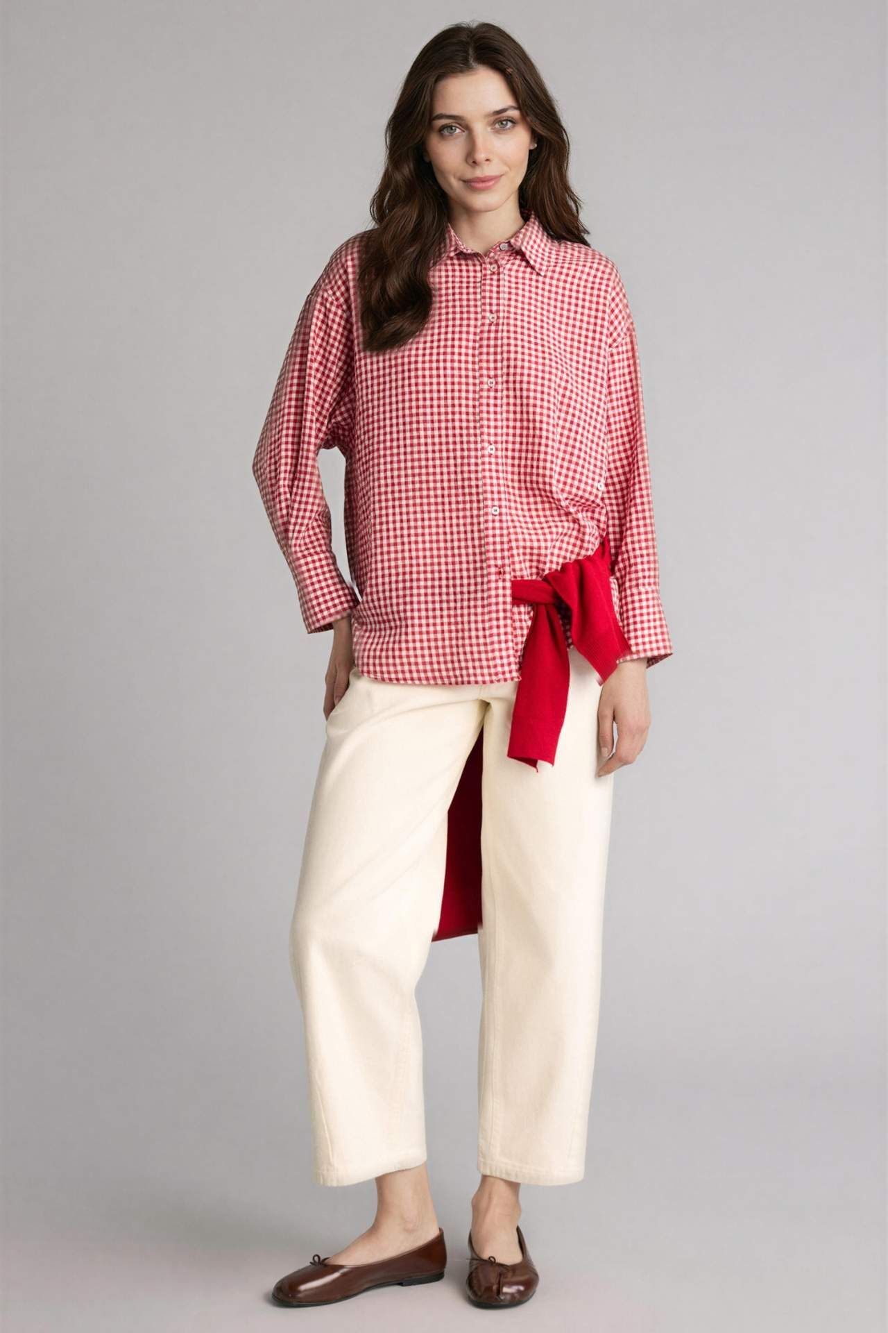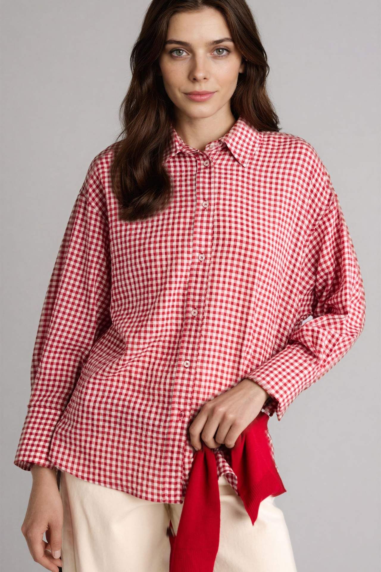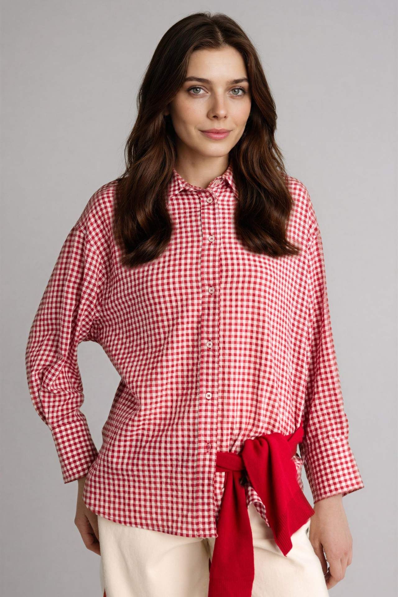 DeFacto Regular Fıt Dama Desenli Krinkıl Kumaş Uzun Kollu Tunik