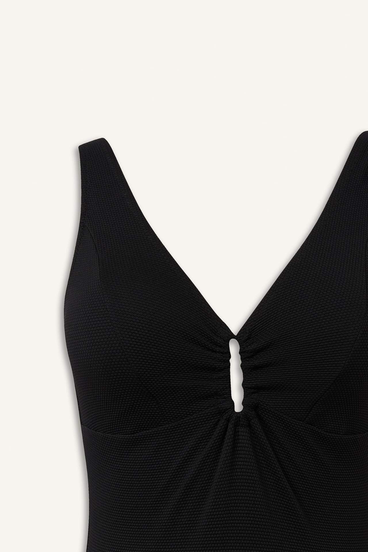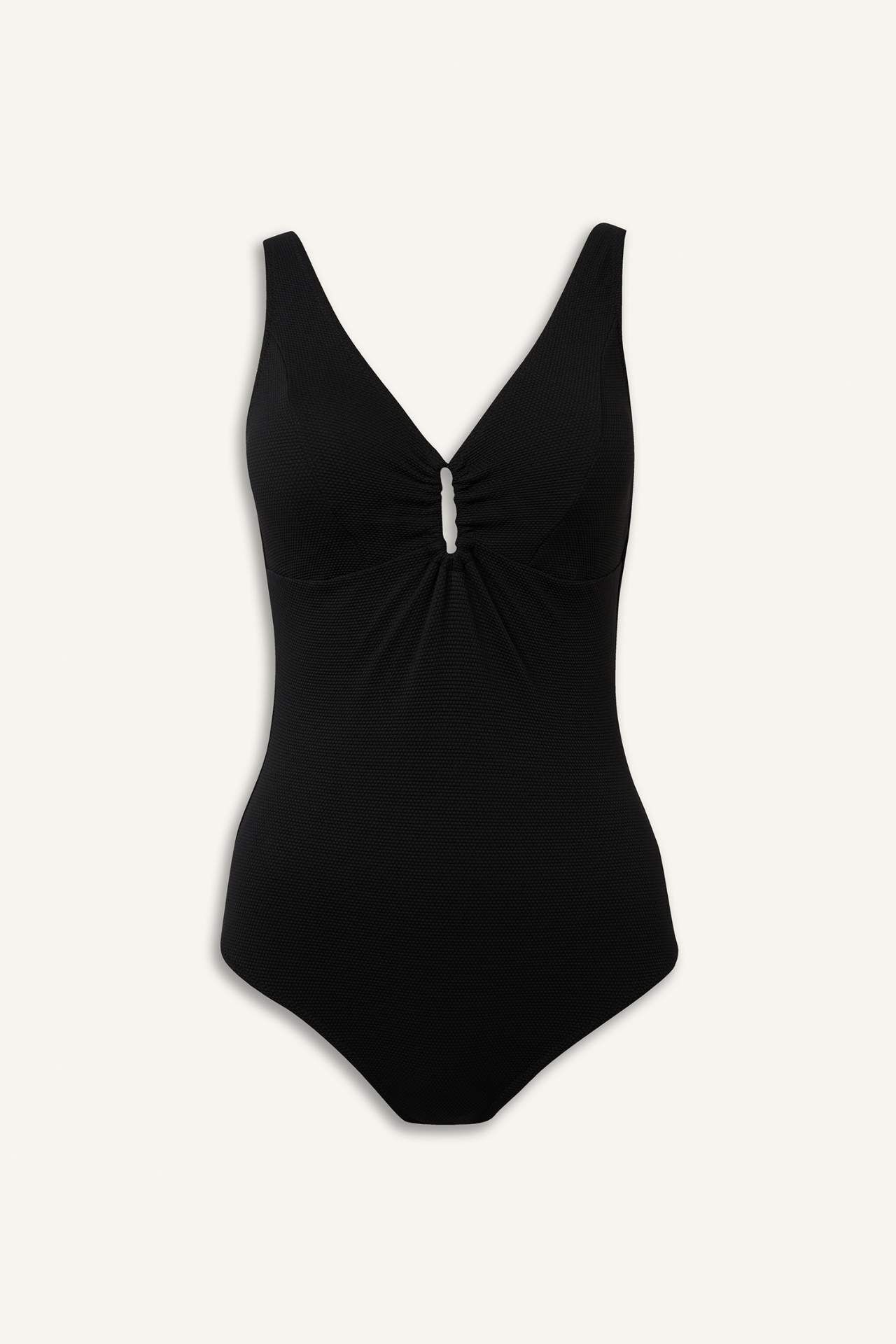 Siyah tek parça mayo. V yaka, geniş askılı. Göğüs kısmında büzgü detayı ve metalik görünümlü halka aksesuarı. Normal kesim. Elastan 6%,Poliester 94%,Elastan 7%,Naylon 93%