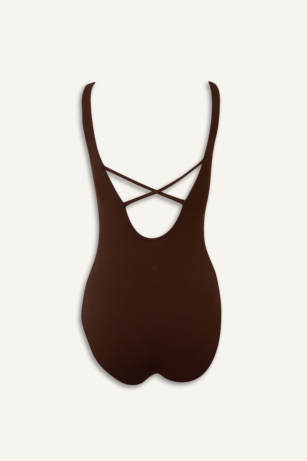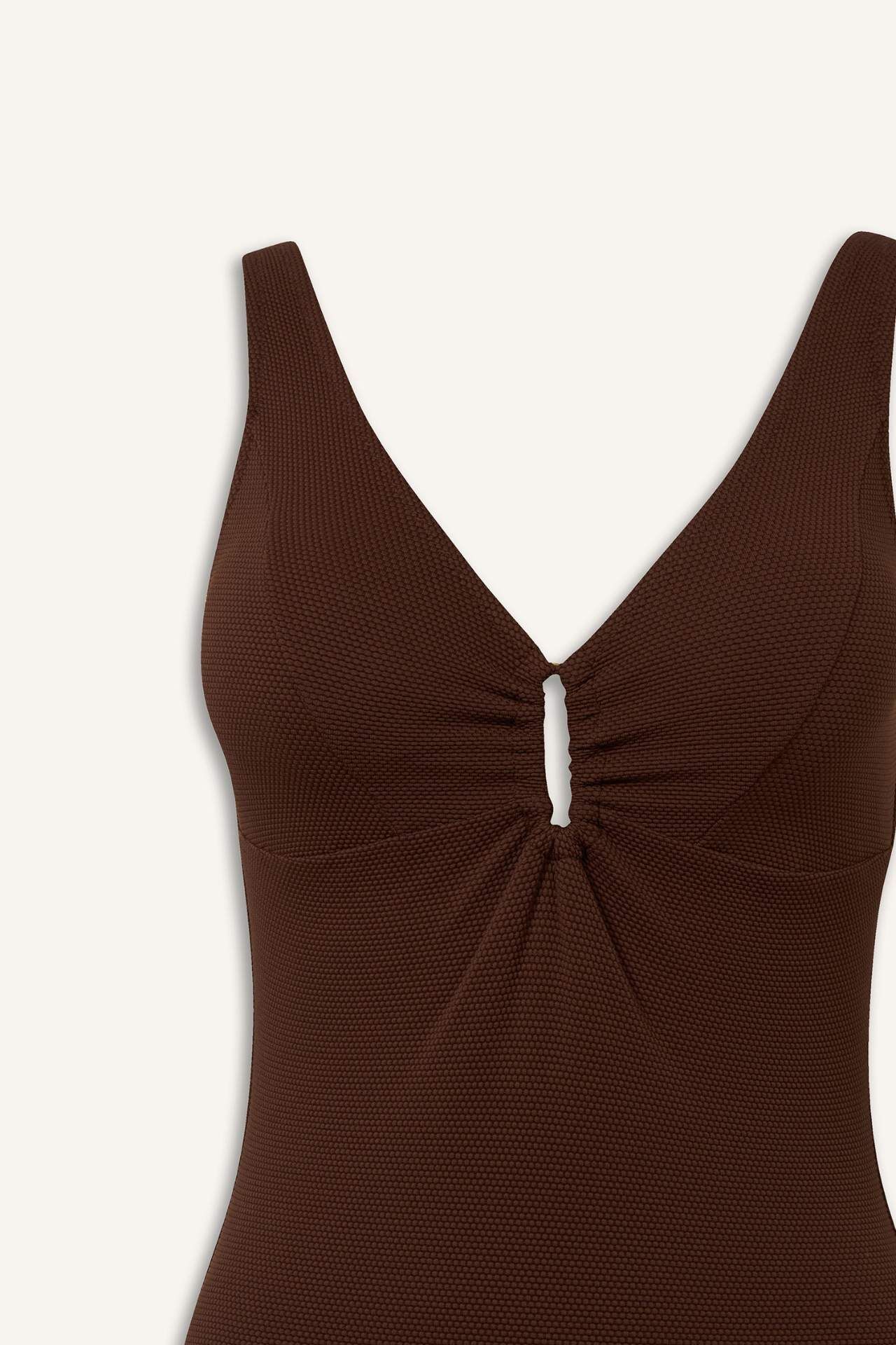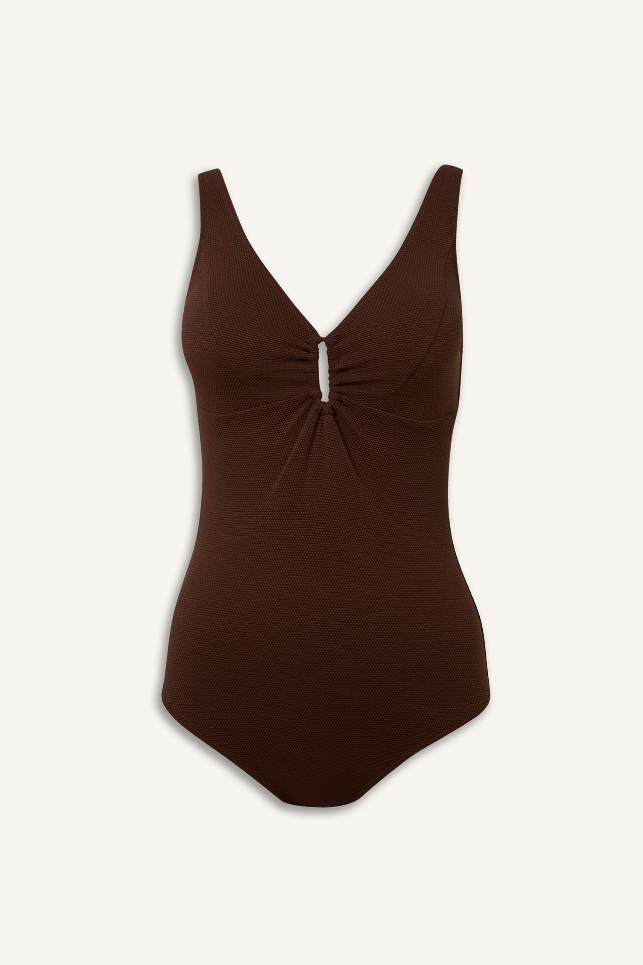 Düz renk V yaka tek parça mayo. Geniş askılı. Göğüs ortasında büzgü ve metal detaylı. Elastan 6%,Poliester 94%,Elastan 7%,Naylon 93%