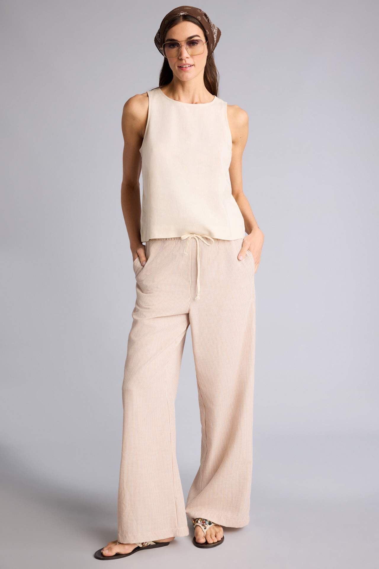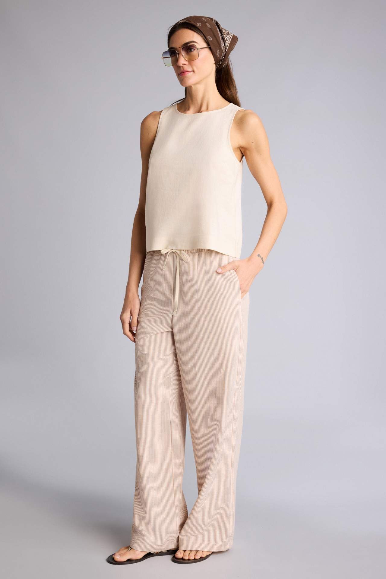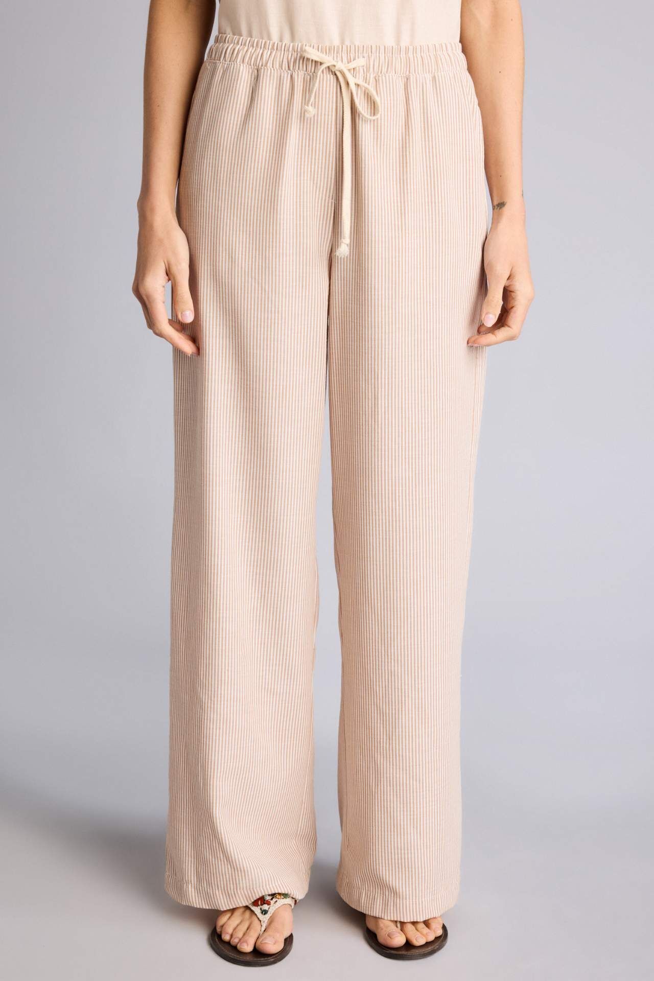 Yetişkinler için yüksek bel dokuma pantolon. Çizgili desen ve regular fit kalıp. Oxford kumaşından, geniş paça detayıyla bej renk seçeneği. Kadınların yaz mevsiminde tercihi. Temel çeşit pantolon. Poliester 100% Manken Bedeni: Göğüs: 89 Boy: 1,78 Basen: 92 Bel: 63