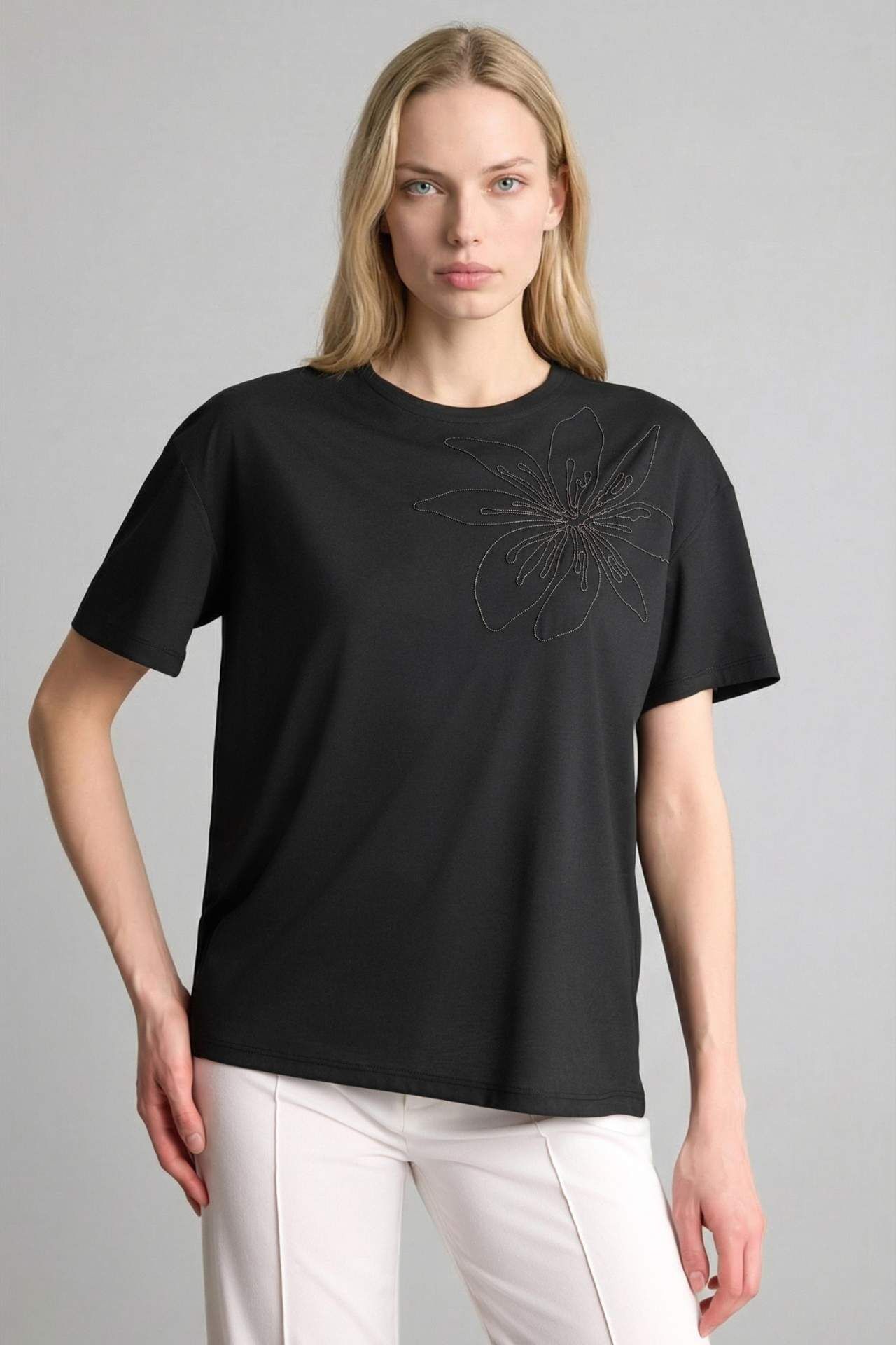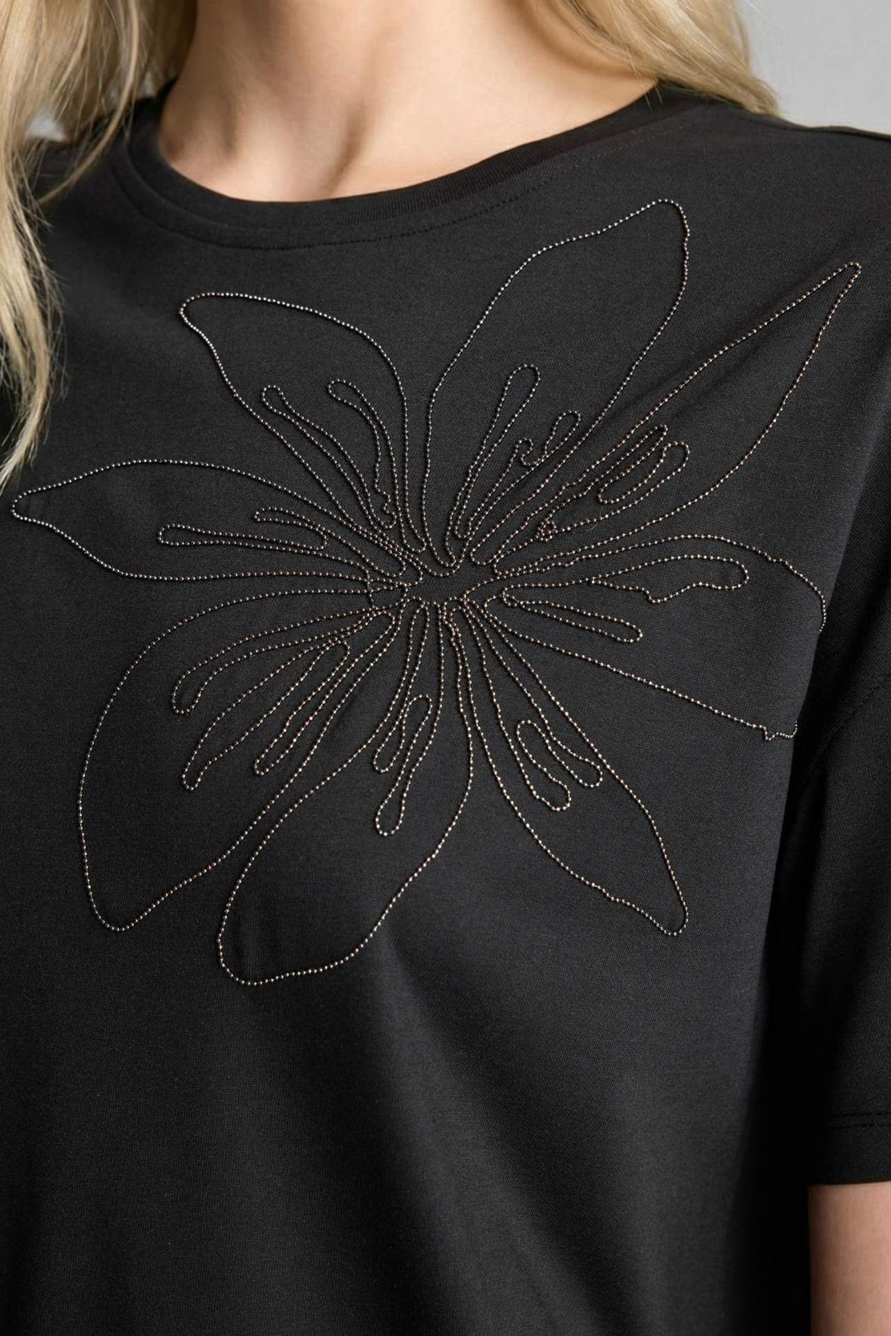 Relaxed fit kadın tişört. Bisiklet yaka ve kısa kollu. Baskılı. Viskoz 35%,Poliester 65% Manken Bedeni: Göğüs: 81 Boy: 1,77 Basen: 92 Bel: 62