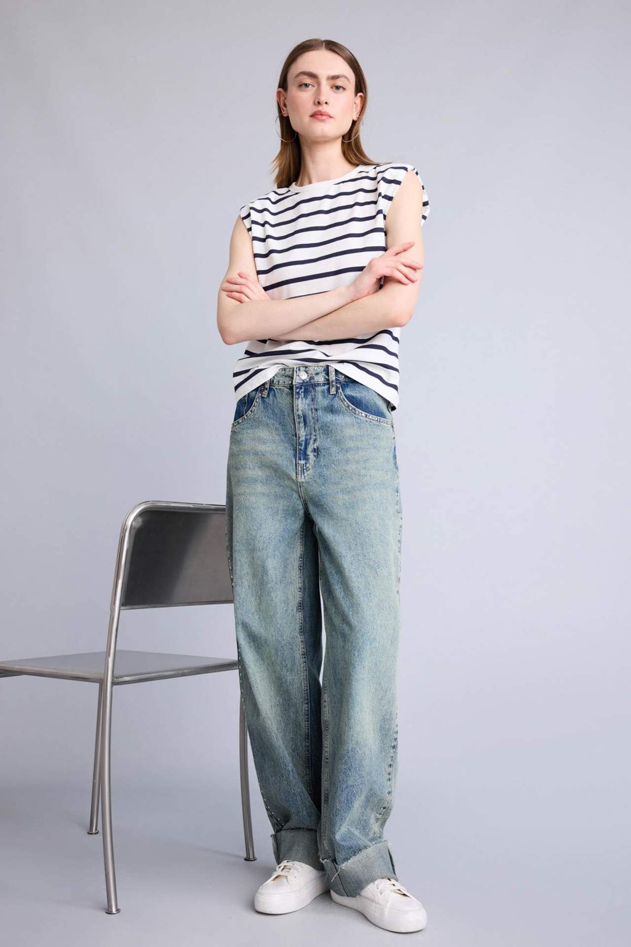Relaxed fit kadın tişört. Bisiklet yaka ve kısa kollu. Slogan baskılı. Pamuk 100% Manken Bedeni: Göğüs: 80 Boy: 1,76 Basen: 90 Bel: 60