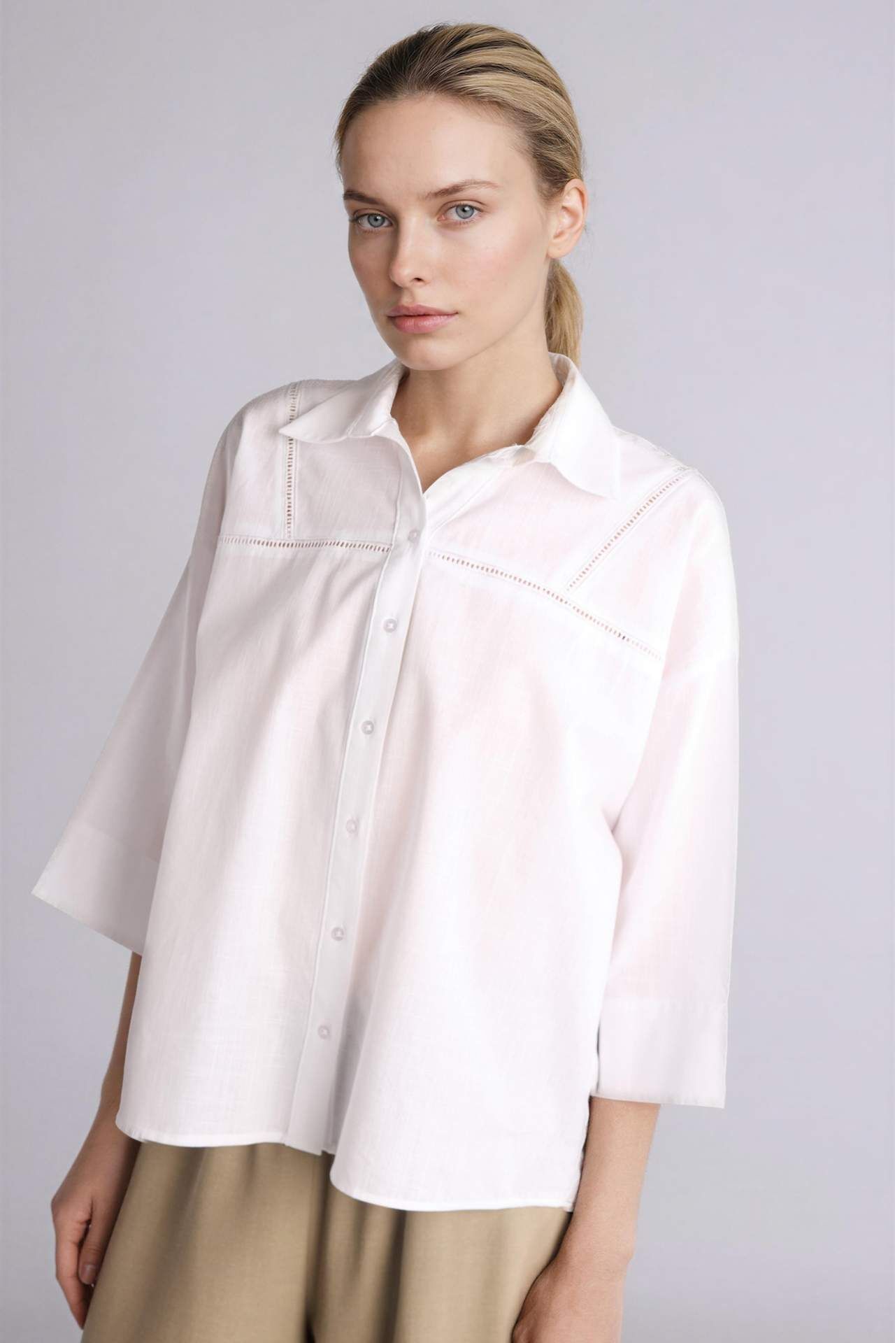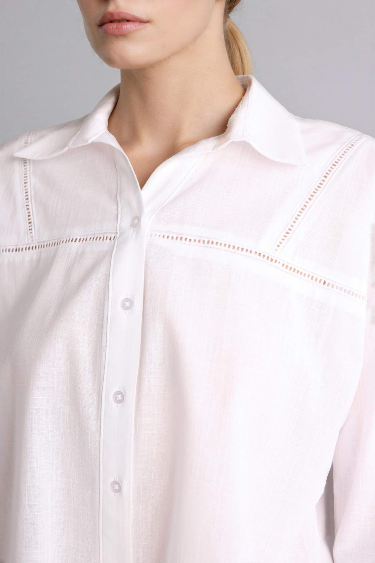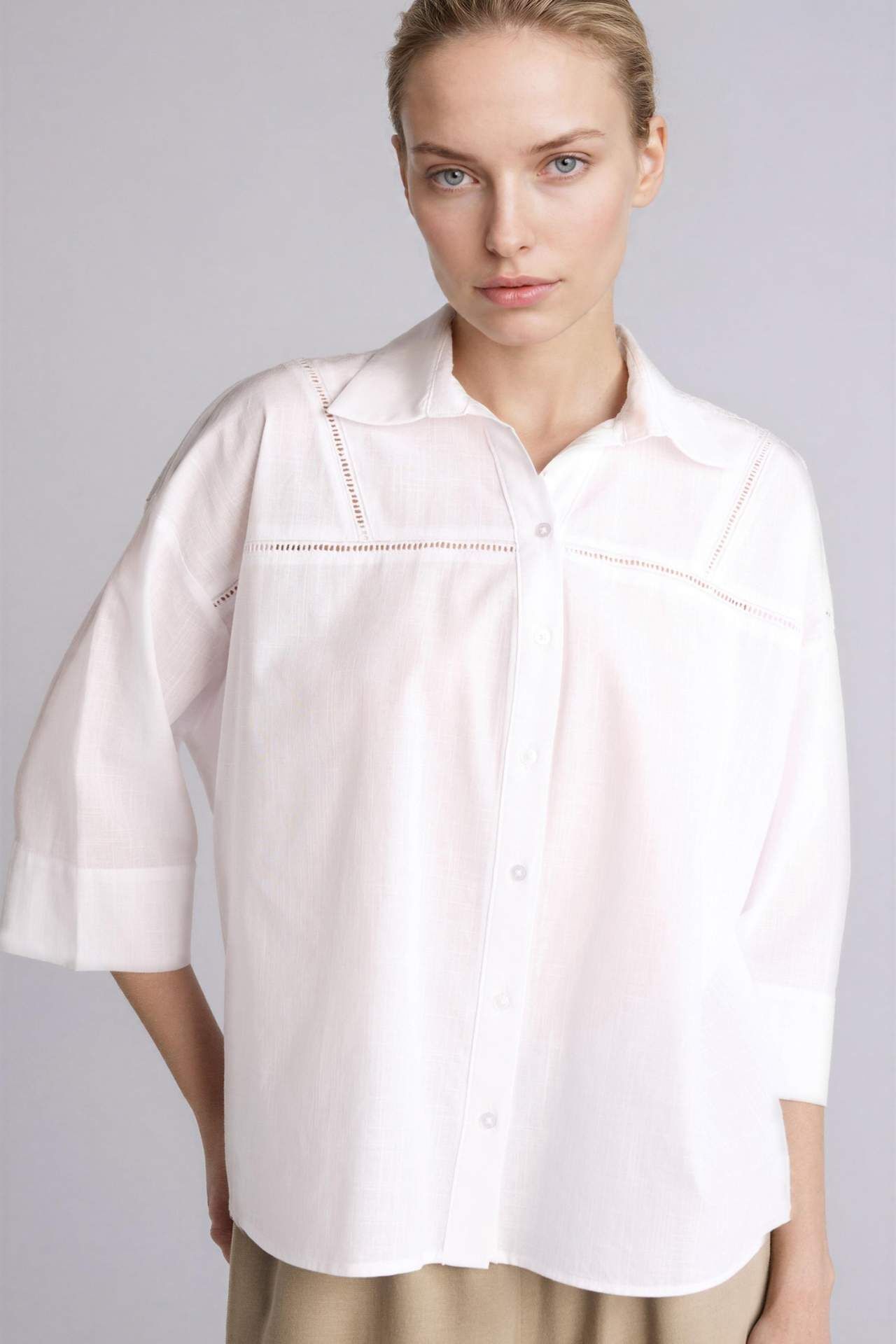 Relax fıt kalıbı ve yarım kol detayıyla flamlı pamuk dokuma üst. Beyaz renkli, dantel detaylı uzun kollu gömlek. Pamuk 100% Manken Bedeni: Göğüs: 84 Boy: 1,72 Basen: 92 Bel: 61