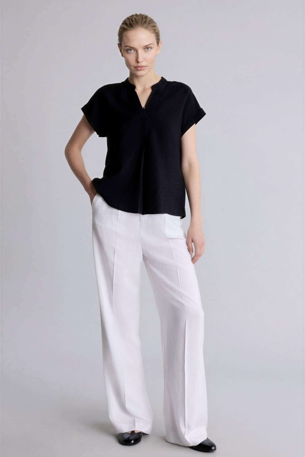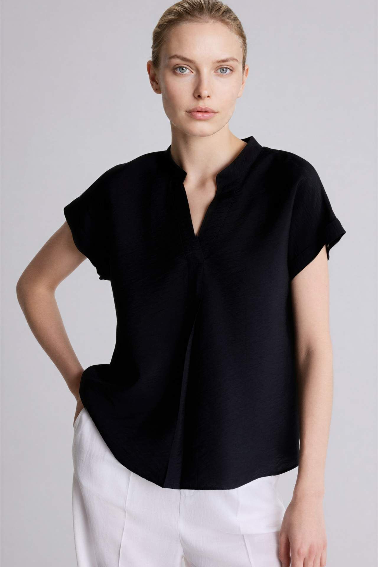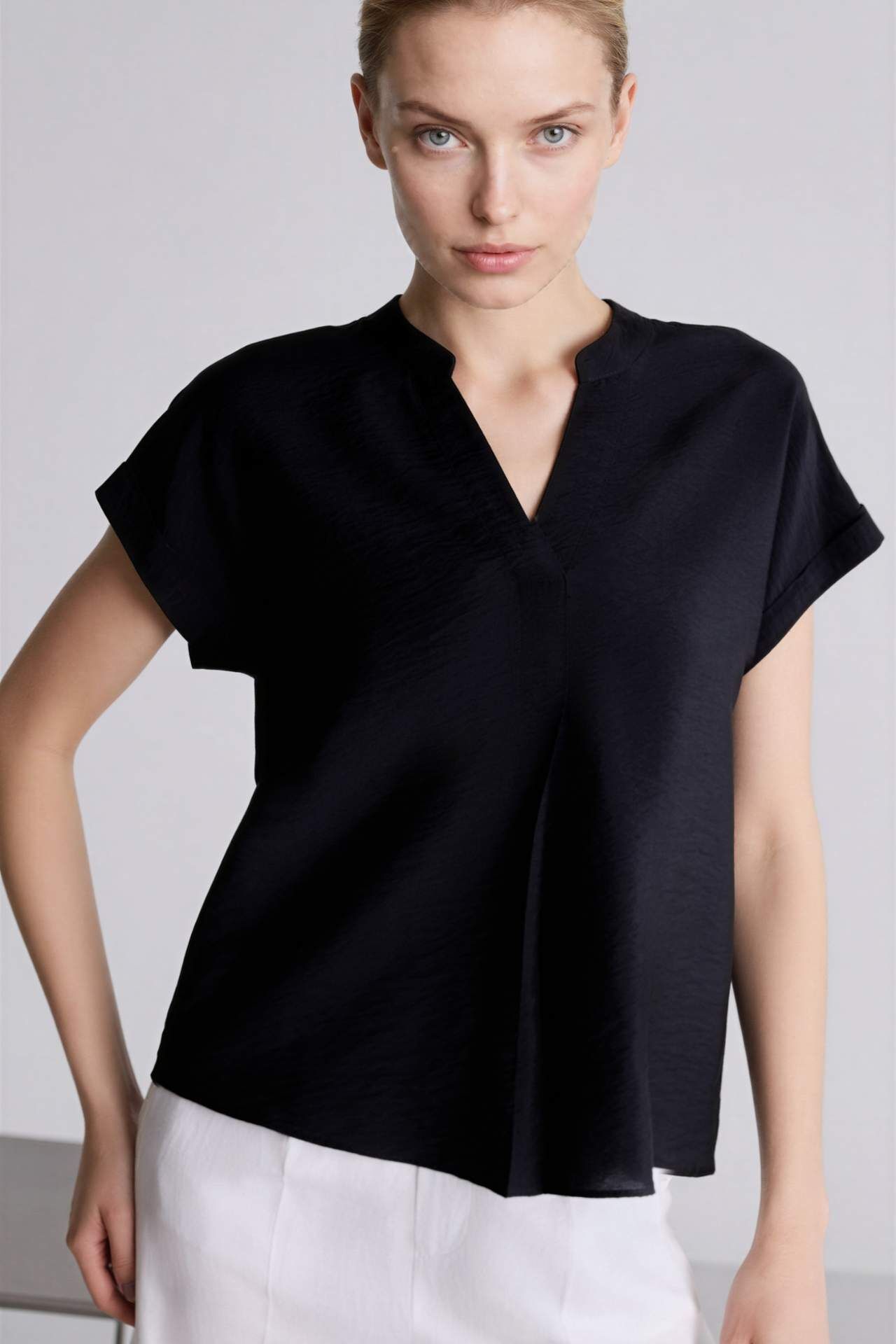 Yetişkin kadınlar için ideal bir seçim olan siyah kısa kollu bluz, dikkat çekici duble kollu detaylarıyla öne çıkıyor. Rahat relax fit kalıbı ve şık kaçık yaka ile ilkbahar/yaz sezonunda temel çeşitler arasında yer alıyor. Bu bluz, dokuma üst kategorisindeki kadınlar için mükemmel bir tercih. Poliamid 13%,Viskoz 87% Manken Bedeni: Göğüs: 81 Boy: 1,77 Basen: 92 Bel: 62