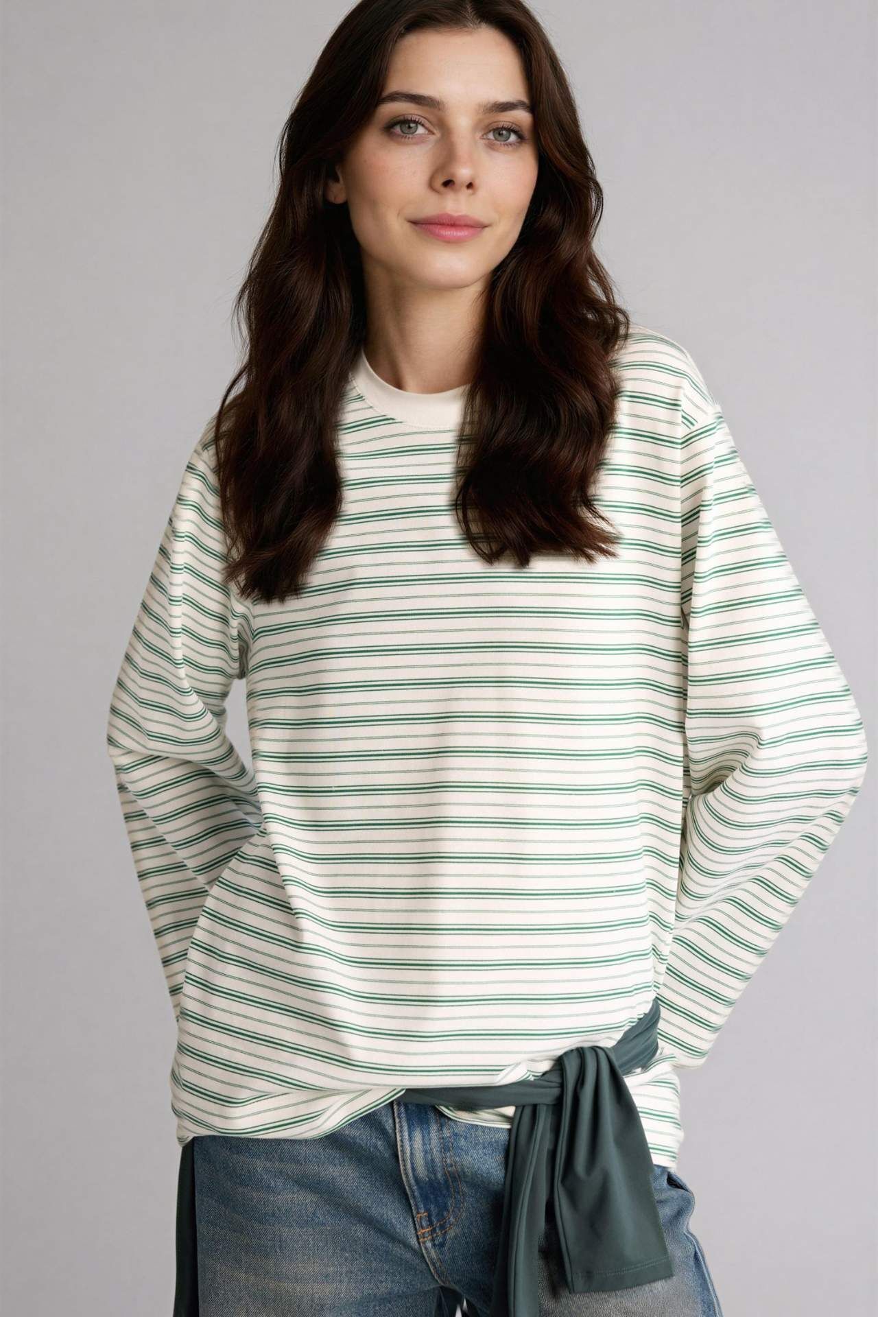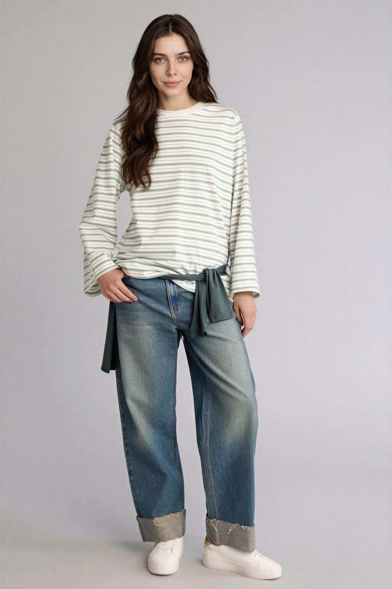 Yeşil uzun kollu tunik. Örme kumaşı ve relax fit kalıbıyla şıklığı ve rahatlığı bir arada sunar. Pamuk 100% Manken Bedeni: Göğüs: 88 Boy: 1,72 Basen: 90 Bel: 60
