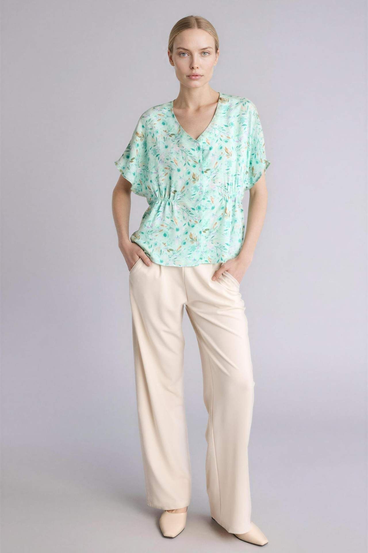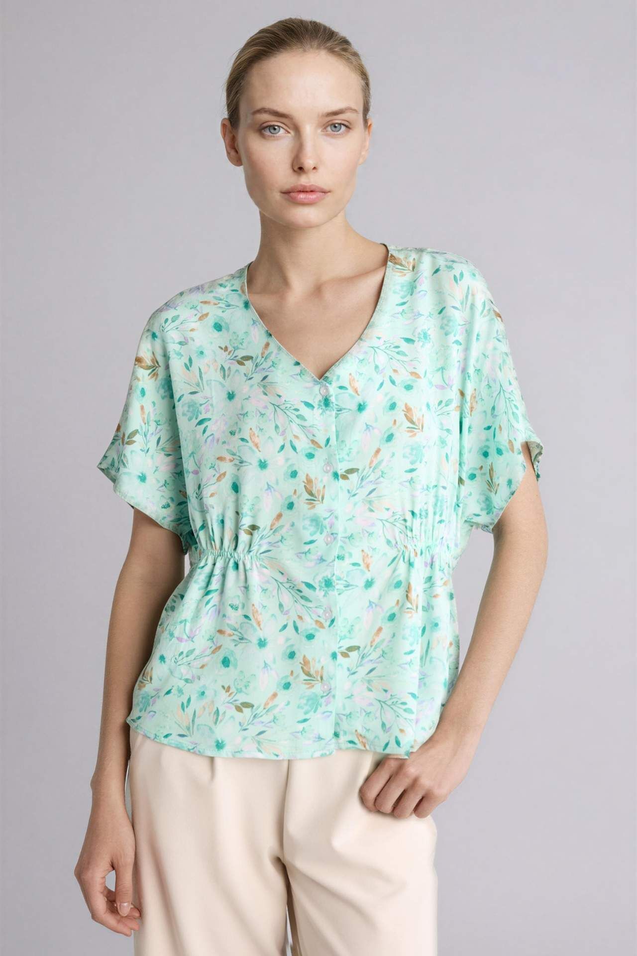 Relaxed fit kadın gömlek. V yaka ve kısa kollu. Baskılı desen. Viskoz 100% Manken Bedeni: Göğüs: 84 Boy: 1,72 Basen: 92 Bel: 61