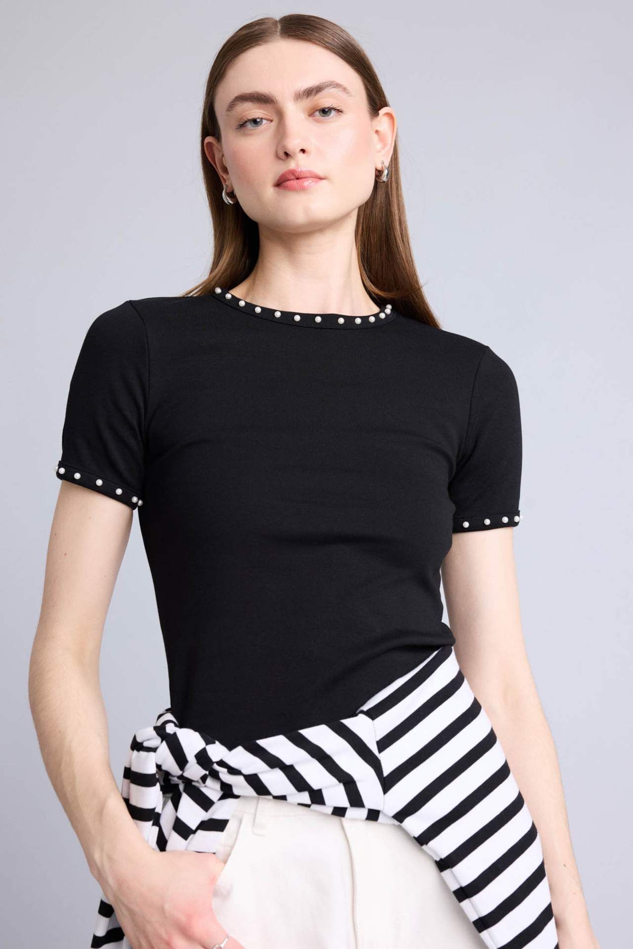 Ribana kumaştan üretilmiş slim fit kadın tişört. Bisiklet yaka ve kısa kollu. Pamuk 96%,Elastan 4% Manken Bedeni: Göğüs: 80 Boy: 1,76 Basen: 90 Bel: 60