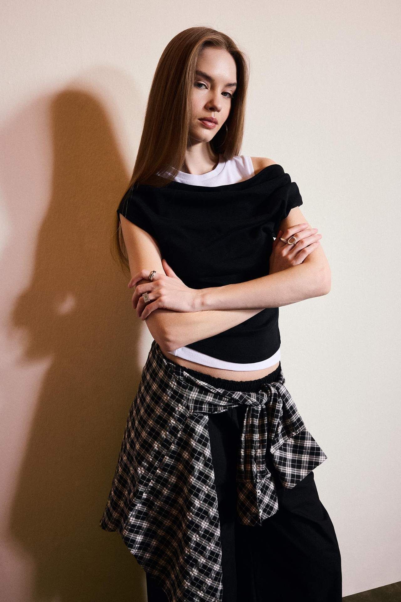 Yetişkin kadınlar için yaz aylarında özgürce hareket etmeleri için tasarlanmış siyah ribana kısa kollu tişört. Slim fit kalıbı ve düşük omuz detayıyla şıklığı ve konforu bir arada sunar. Örme kategorisinde yer alan bu temel parça, tek omuzlu yaka tasarımıyla dikkat çeker. Pamuk 100%,Pamuk 100% Manken Bedeni: Göğüs: 82 Boy: 1,77 Basen: 88 Bel: 59