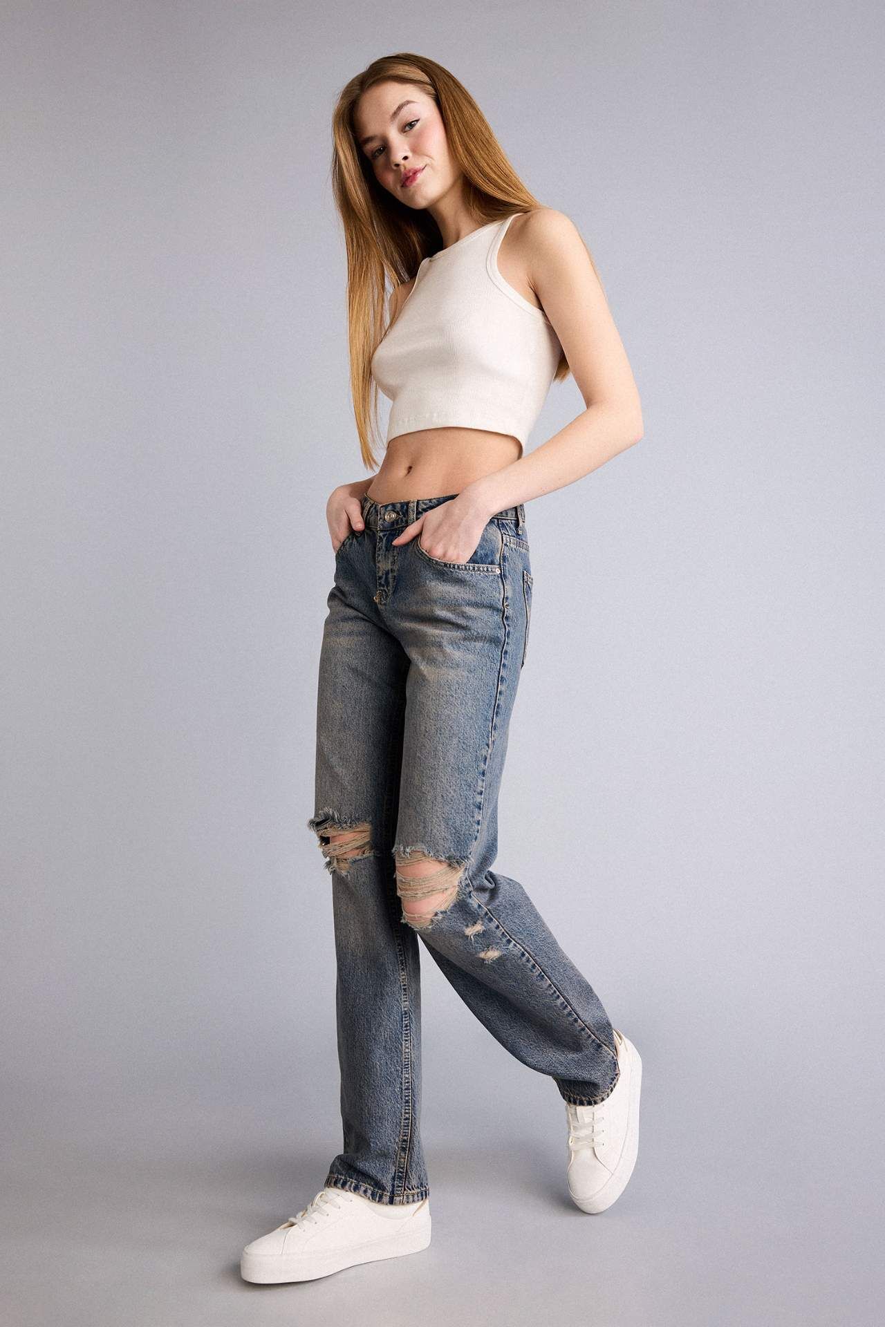 Düşük bel yırtık detaylı jean. Slim fit kalıbı ile şık ve rahat bir görünüm sunar. Pamuk 100%,Elastan 0% Manken Bedeni: Göğüs: 75 Boy: 1,75 Basen: 89 Bel: 61