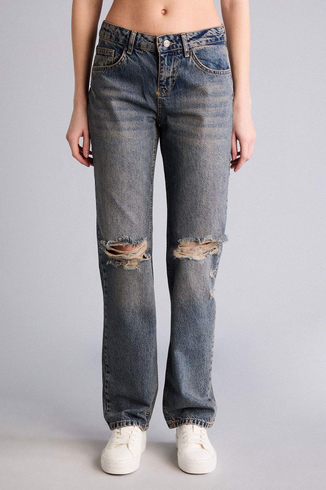 DeFacto Slım Fıt Yırtık Detaylı Düşük Bel Uzun Jean Yıkamalı Pantolon