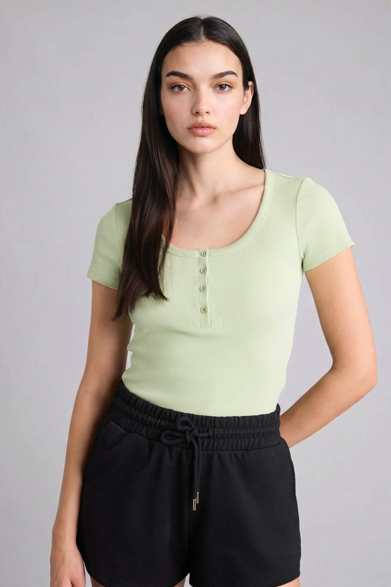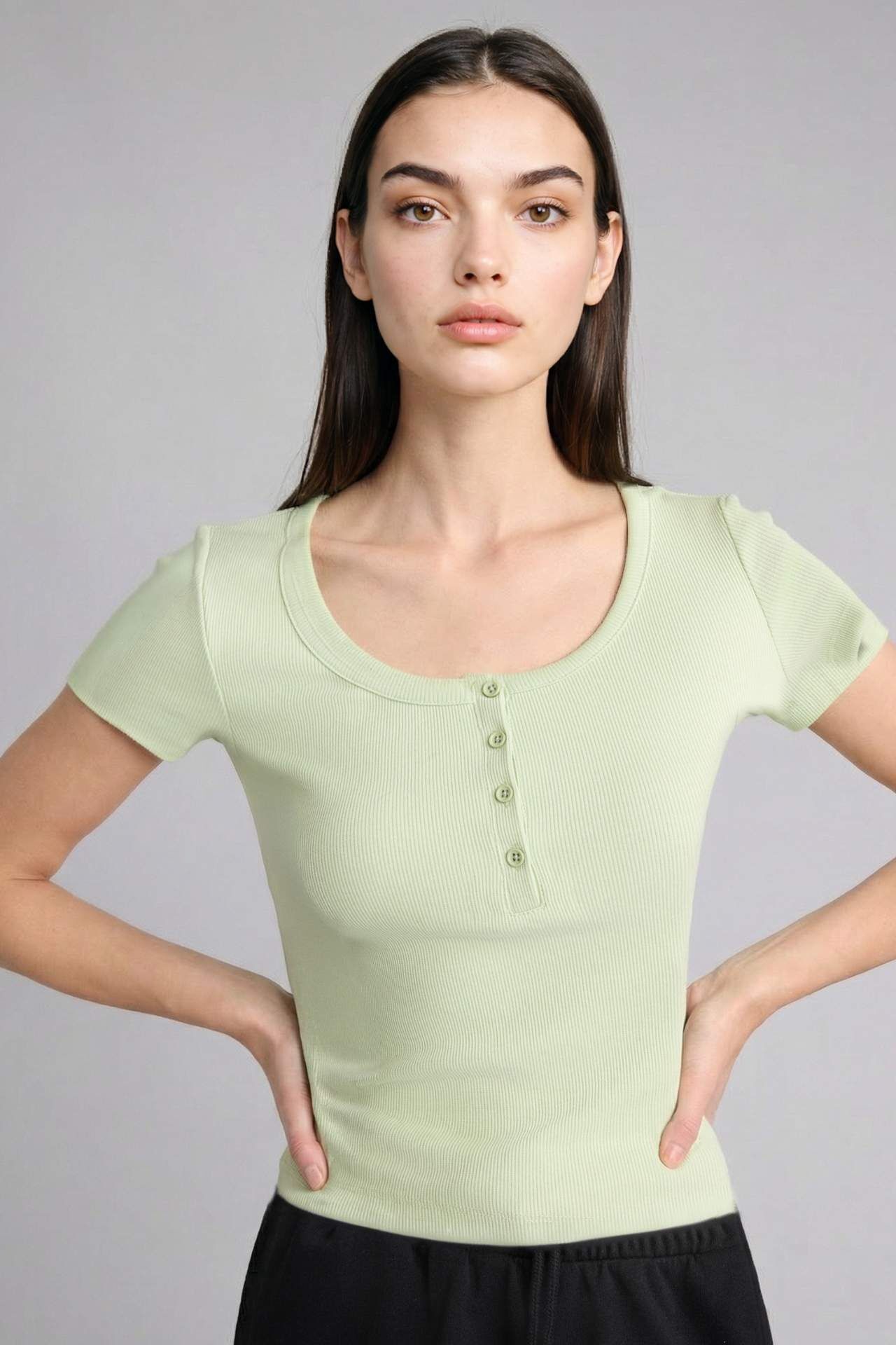 Kaşkorse kumaştan üretilmiş slim fit kadın tişört. Kısa kollu. Pamuk 97%,Elastan 3% Manken Bedeni: Göğüs: 85 Boy: 1,77 Basen: 89 Bel: 62