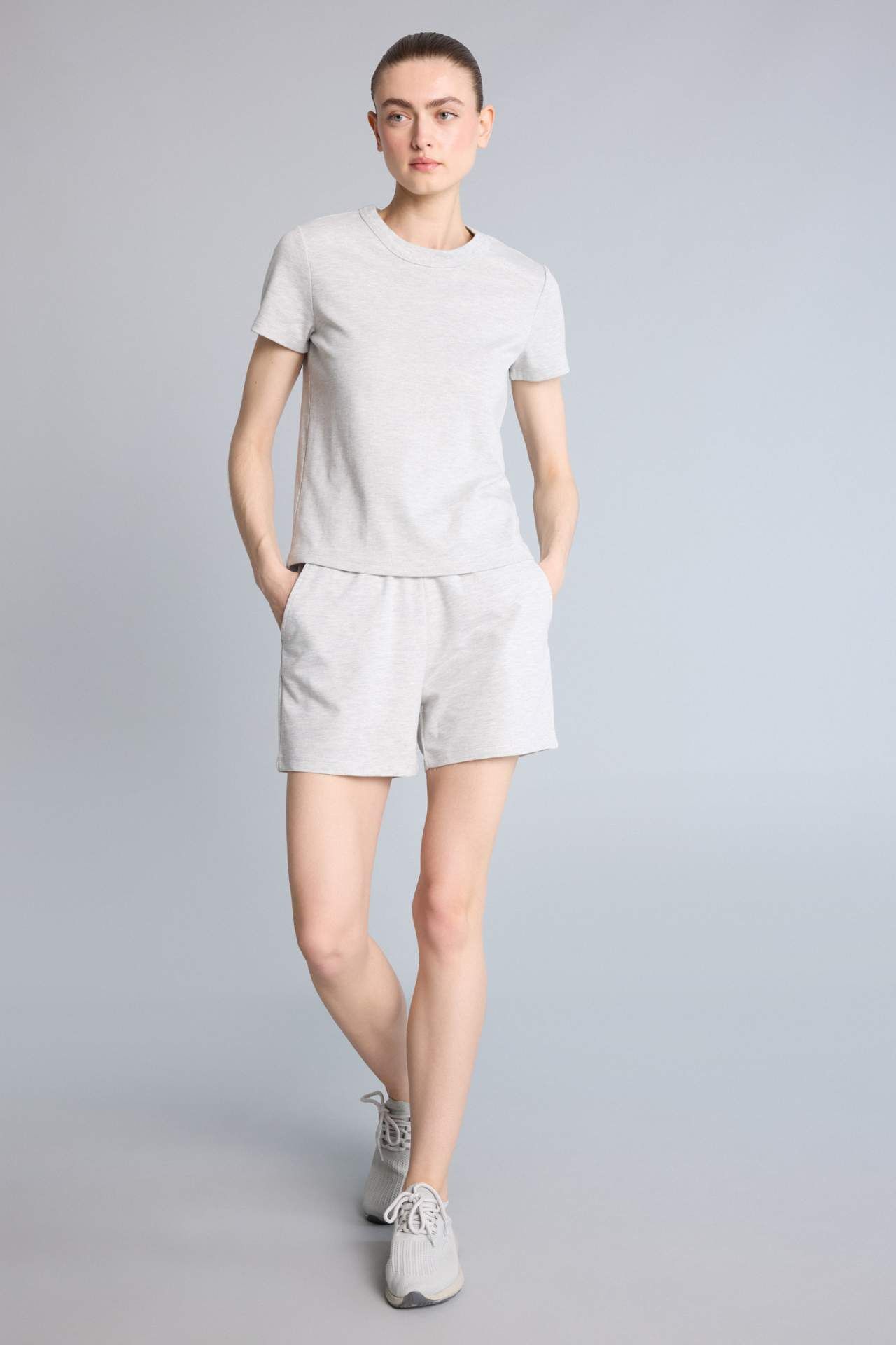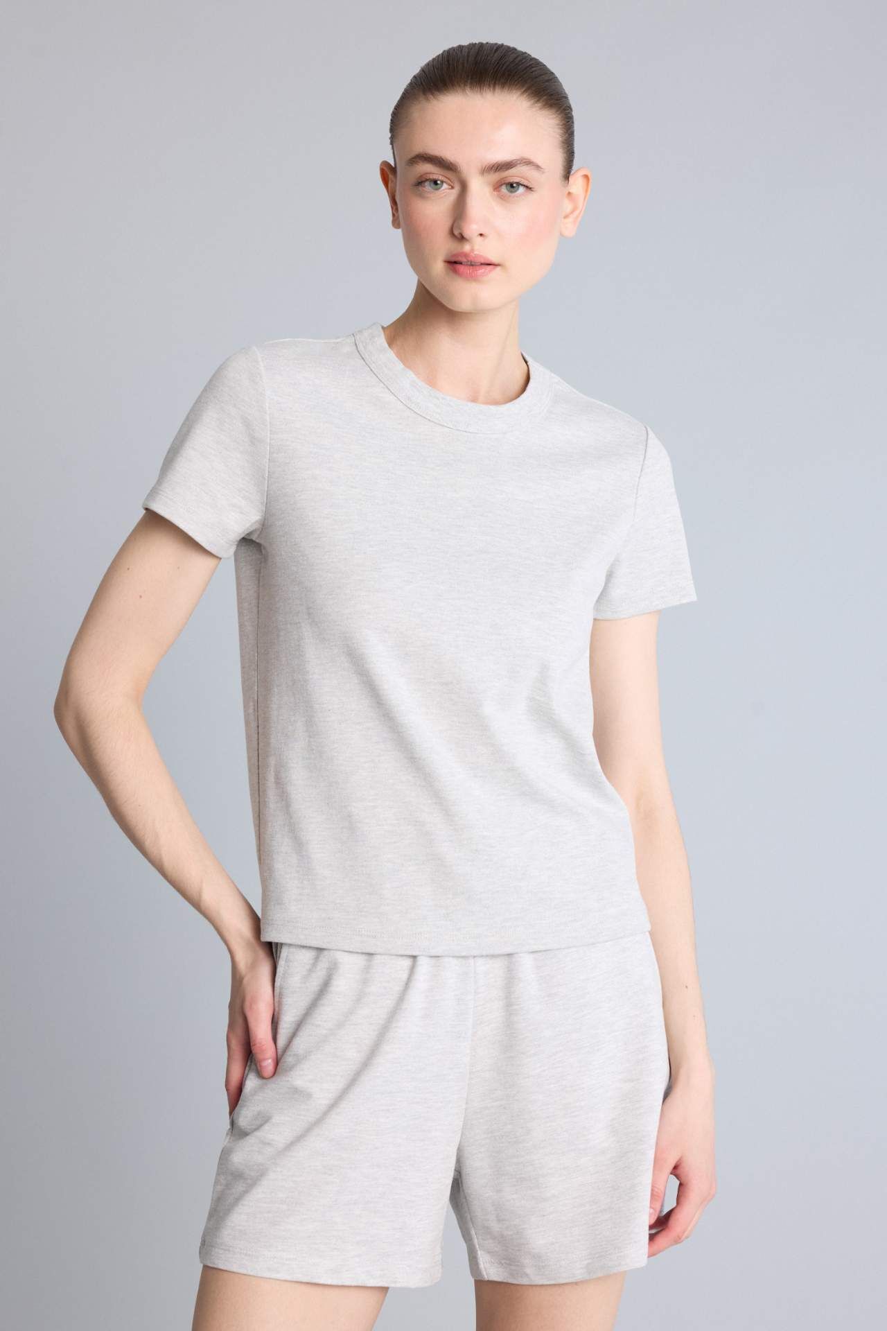 Pamuklu kumaştan üretilmiş standart fit kadın tişört. Bisiklet yaka ve kısa kollu. Pamuk 50%,Poliester 50% Manken Bedeni: Göğüs: 80 Boy: 1,76 Basen: 90 Bel: 60