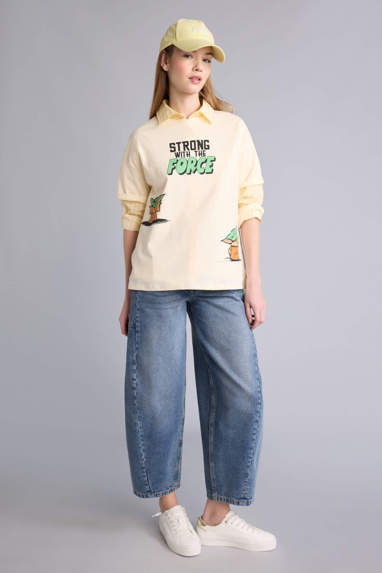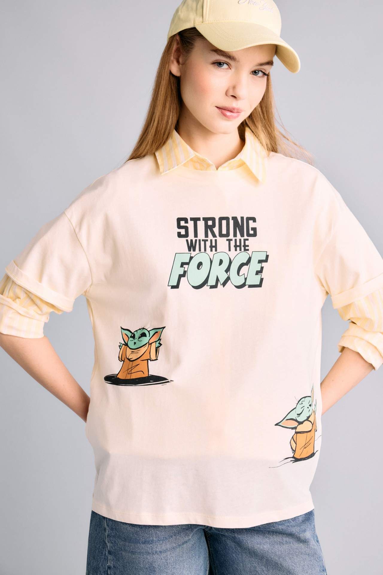 Yetişkin örme kısa kollu tişört, Star Wars lisansıyla öne çıkıyor. Oversıze kalıbı, baskılı deseni ve ekru rengiyle dikkat çekici. Kadın koleksiyonunda yer alan bu tişört, ilkbahar/yaz mevsim koşullarına uygun. Bisiklet yaka ve ribanalı yaka detaylarıyla şık ve konforlu bir seçenek. Coool markasıyla öne çıkan bu tişört, tarzınızı tamamlamak için ideal bir tercih. Pamuk 100% Manken Bedeni: Göğüs: 82 Boy: 1,77 Basen: 88 Bel: 59