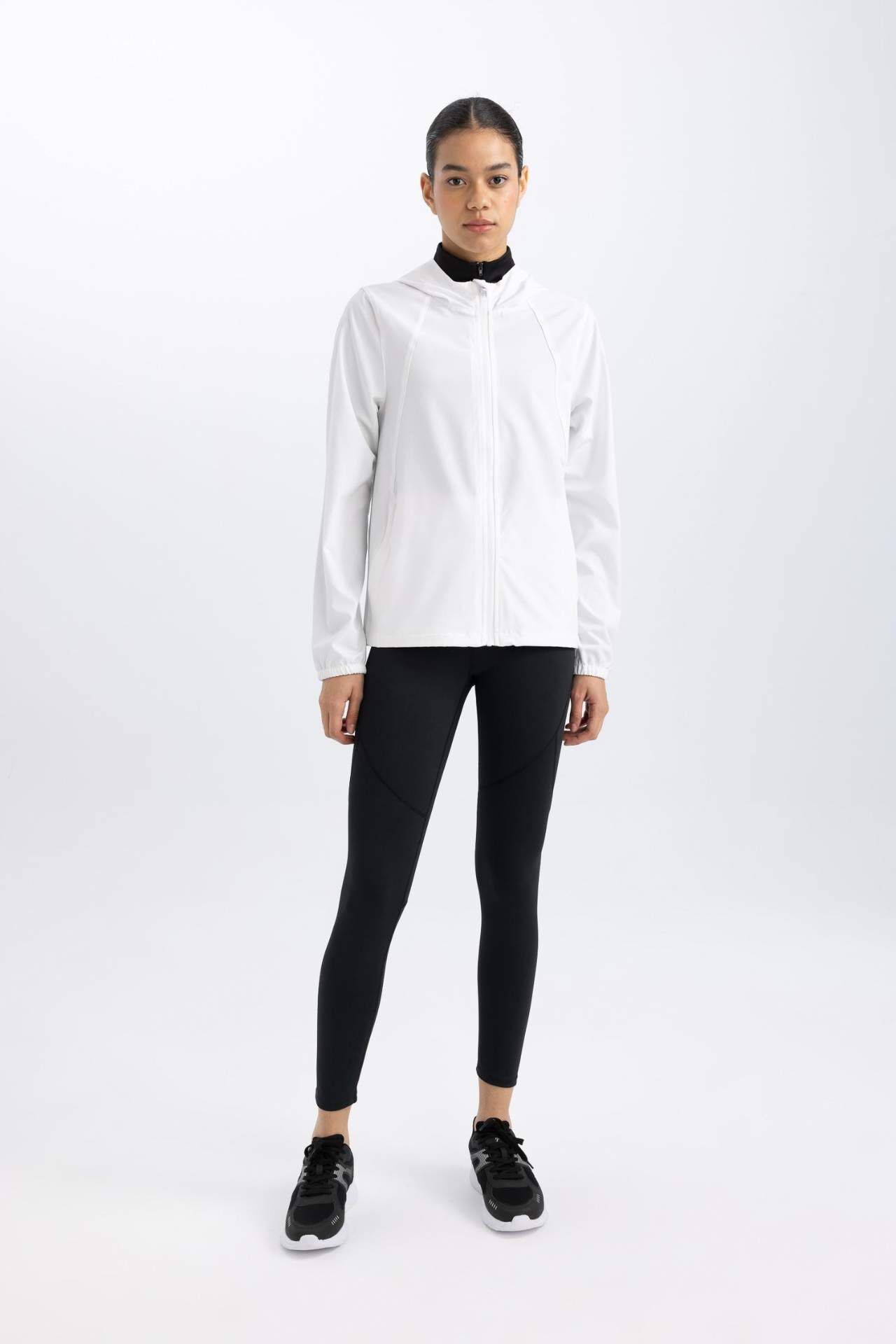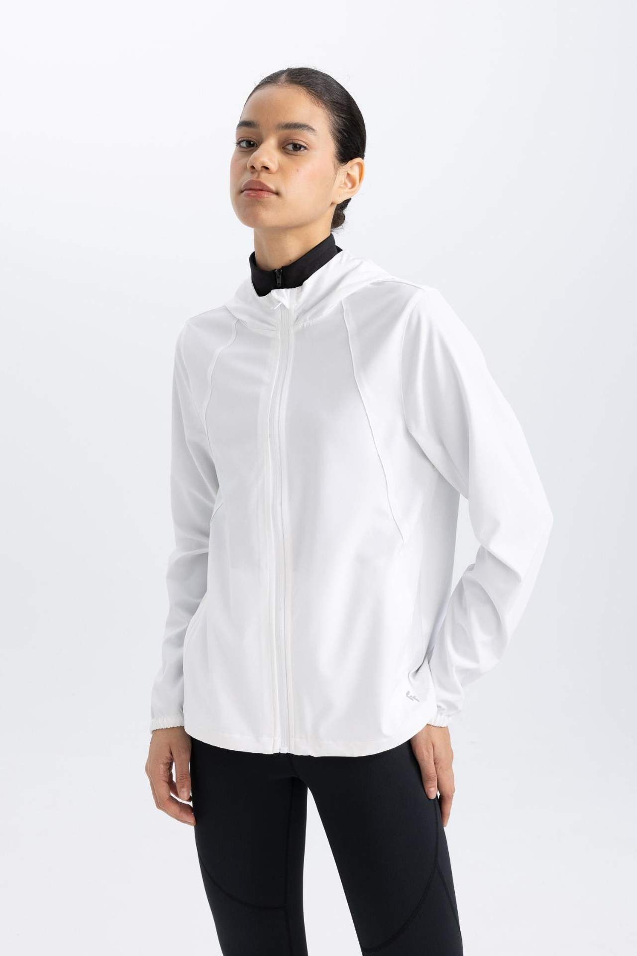 Beyaz renkli, su itici kumaşı, kapüşonlu ve fermuar kapamalı spor modeli ile serin havaların spor kombininin en önemli parçası ile fit bir görünüm sağlayan, form duruşu ile tarzınızın tamamlayıcı parçası olacak DeFactoFit Su İtici Slim Fit Kapüşonlu Yağmurluk Esnek Dokulu Mont.