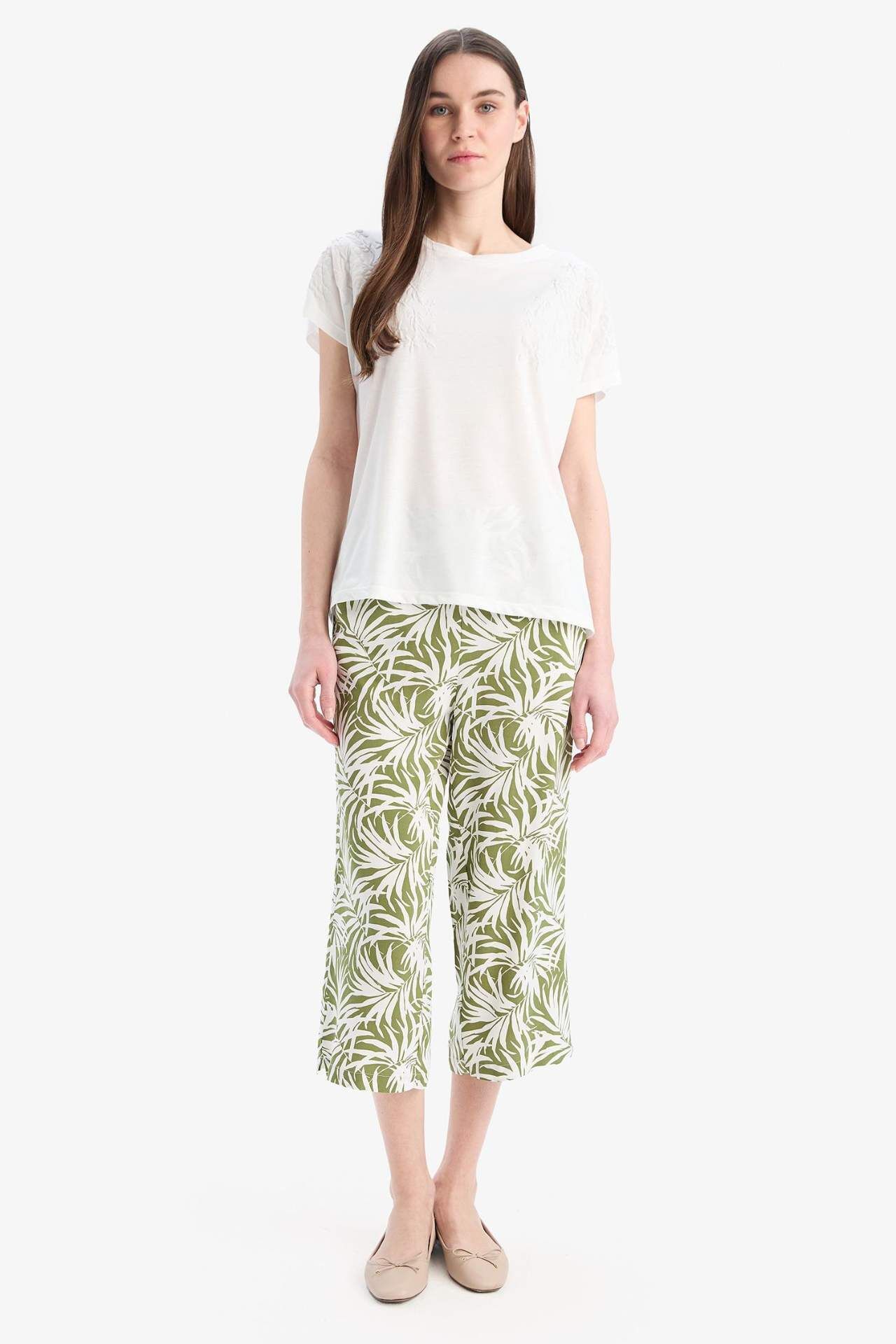 Desenli Düz Paça Kapri, rahat kesimi ve şık desenleriyle günlük kombinlerin vazgeçilmezi. Hafif kumaşı sayesinde sıcak günlerde konforlu kullanım sunar. Viskoz 100%,Viskoz 100%,Viskoz 100%,Viskoz 100%,Viskoz 100% Manken Bedeni: Göğüs: 82 Boy: 1,77 Basen: 91 Bel: 60