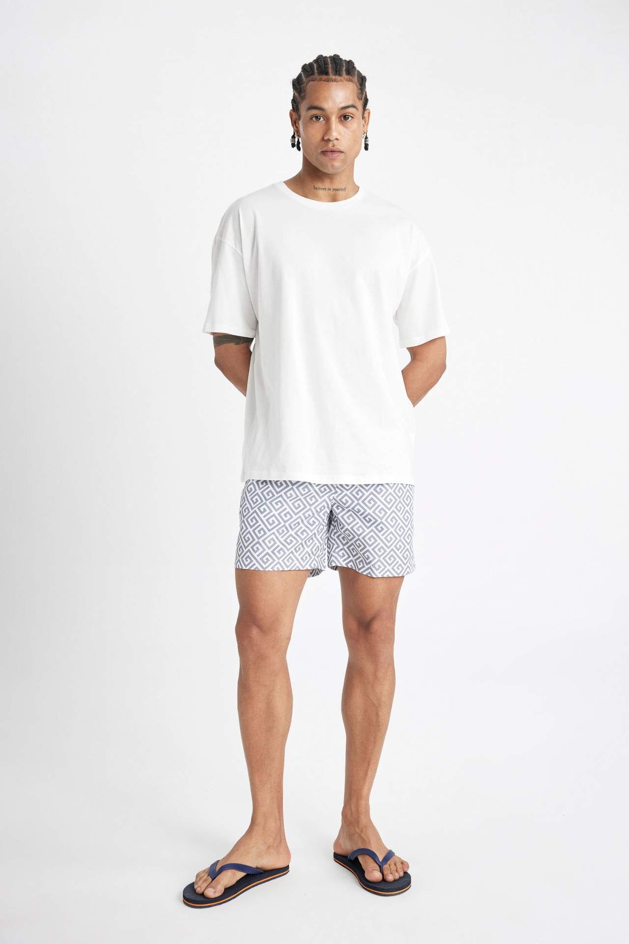 Desenli File Astarlı Kısa Boy Deniz Şortu: Yaz mevsiminde tarzınızı yansıtacak bir parça. Rahat kesimi ve şık deseniyle plajda ve havuzda öne çıkın. Kaliteli malzemelerle üretilmiş olan bu şort, hem şıklığı hem de konforu bir arada sunuyor. Stilinizi yansıtın, güneşin keyfini çıkarın. Poliester 100%,Poliester 100%,Poliester 100%,Poliester 100%