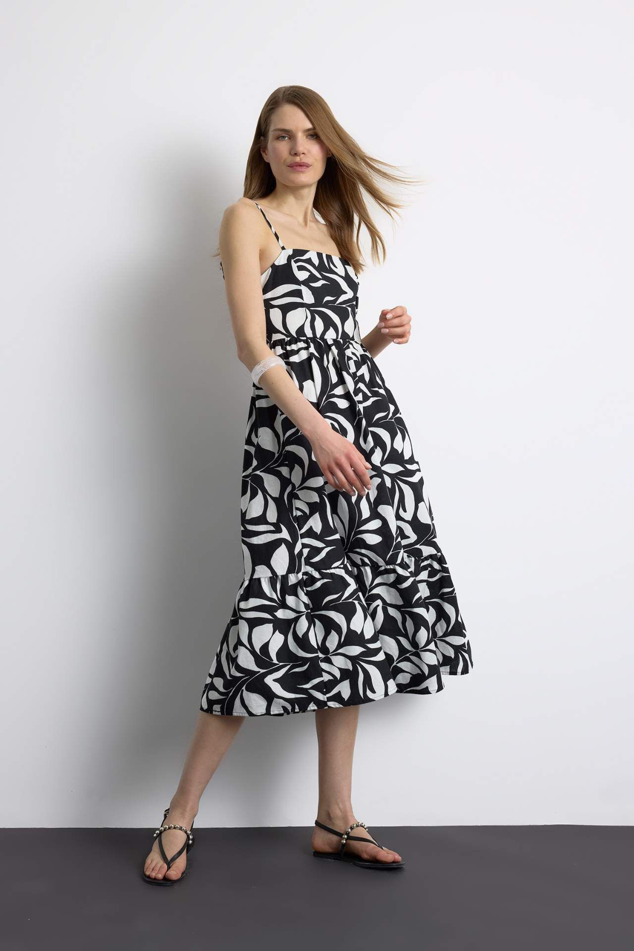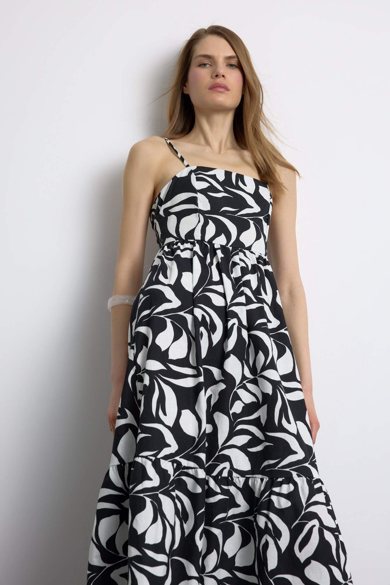 Desenli Keten Görünümlü Askılı Midi Elbise