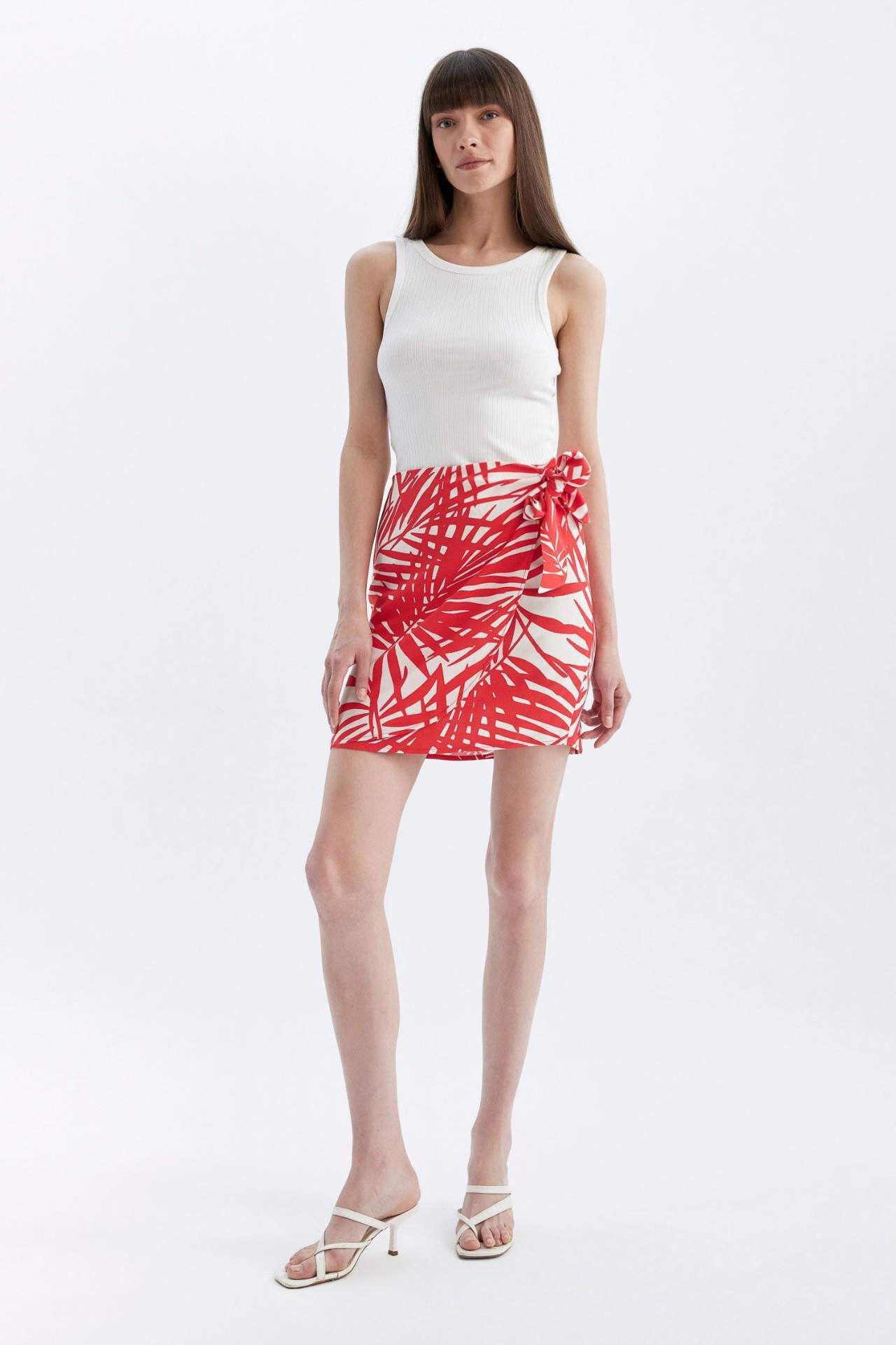 Desenli Normal Bel Keten Karışımlı Mini Etek